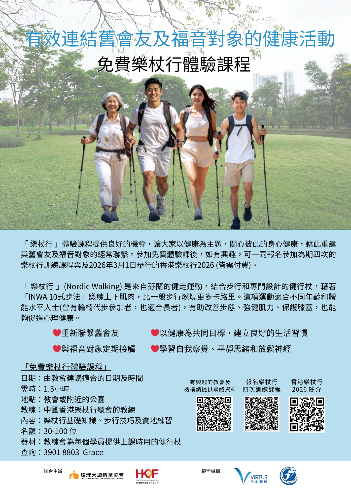 「 樂杖行 」體驗課程提供良好的機會,讓大家以健康為主題,關心彼此的身心健康,藉此重建與會友及福音對象的經常聯繫。參加免費體驗課後,如有興趣,可一同報名參加為期四次的樂杖行訓練課程與及2026年3月1日舉行的香港樂杖行2026 (皆需付費)。