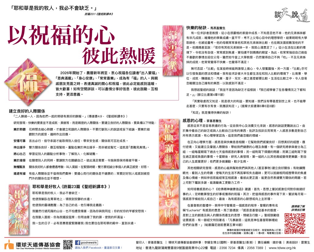 2026年開始了,農曆新年將至,衷心祝福各位讀者「出入蒙福」、「恩典滿載」、「身心安康」、「常常喜樂」,成為有「福」的人。與親戚朋友見面之時,表達真誠的關心和祝福,彼此必定能感到溫暖,皆大歡喜!如有空間詳談,可以盡情分享好信息,彼此鼓勵,互相支持,更添意義。