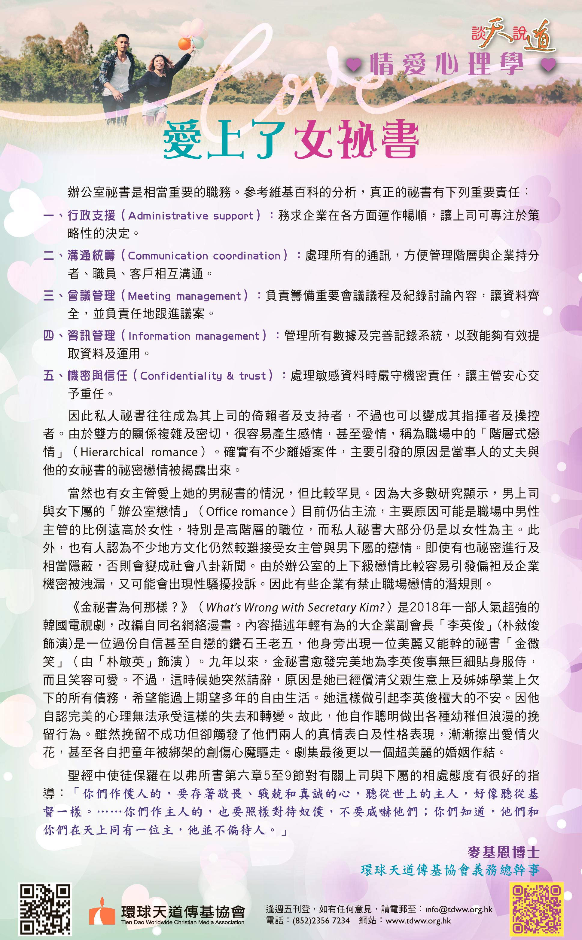 因此私人祕書往往成為其上司的倚賴者及支持者,不過也可以變成其指揮者及操控者。由於雙方的關係複雜及密切,很容易產生感情,甚至愛情,稱為職場中的「階層式戀情」(Hierarchical romance)。確實有不少離婚案件,主要引發的原因是當事人的丈夫與他的女祕書的祕密戀情被揭露出來。