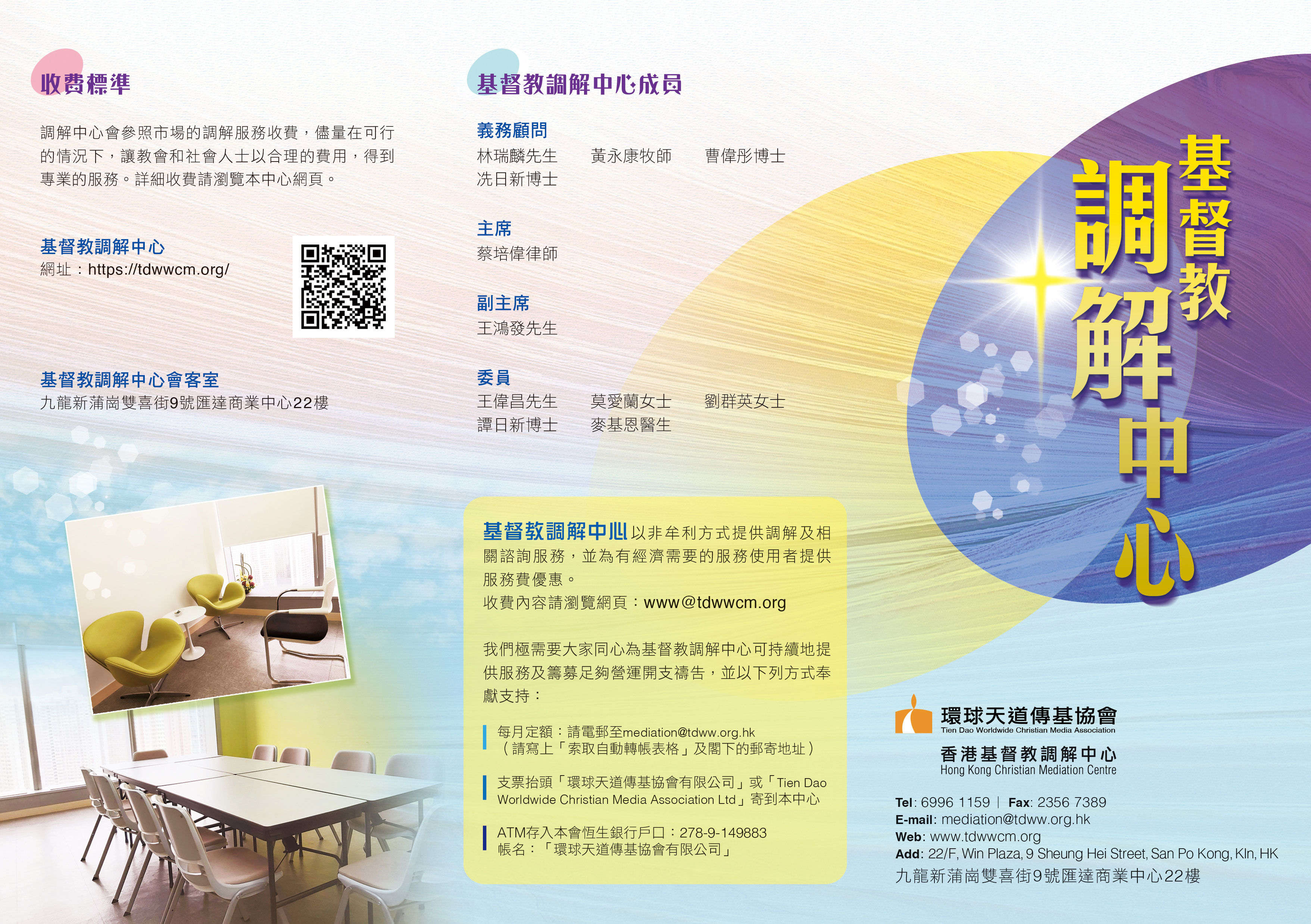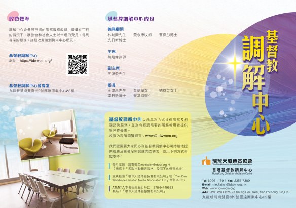 三. 基督教調解服務:把「使人和睦」這基督教觀念普及信徒,舉辦實用的調解課程、推廣由有專業資格的基督徒主理的調解服務。這方面將會配合早已開展的「關心學童計劃──青少年心理健康」事工。除了推介講座之外,期望今年內開展到校輔導服務,以及推行「使人和睦大使」活動。當然我們會繼續推行目前各項有意義的事工,特別是在大眾傳媒出版《談天說道》這非常有價值的專題及專業文章。