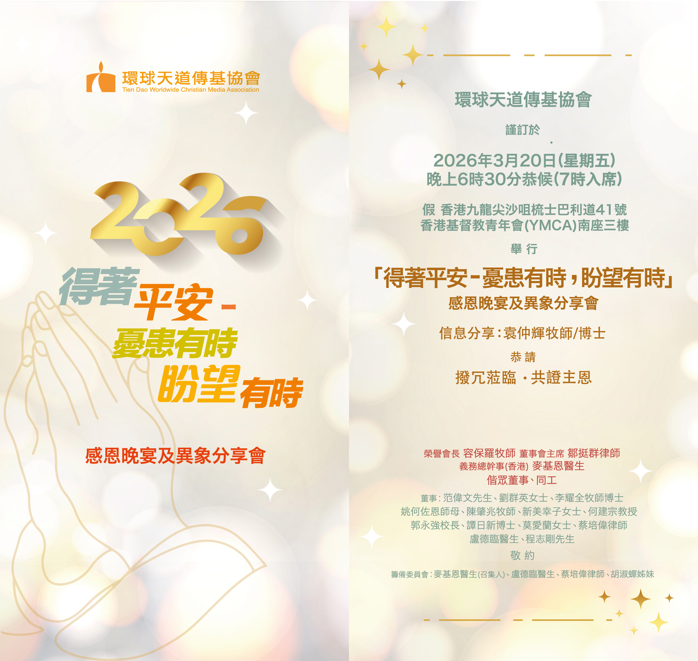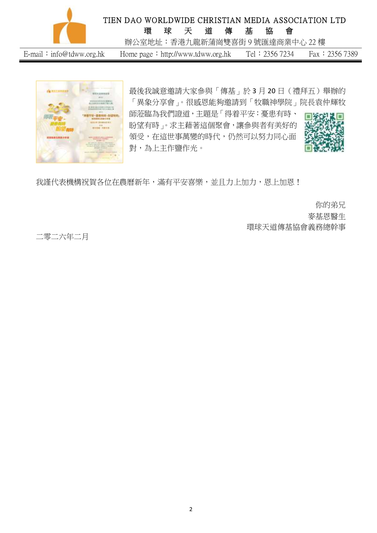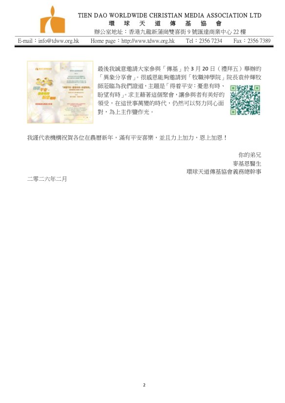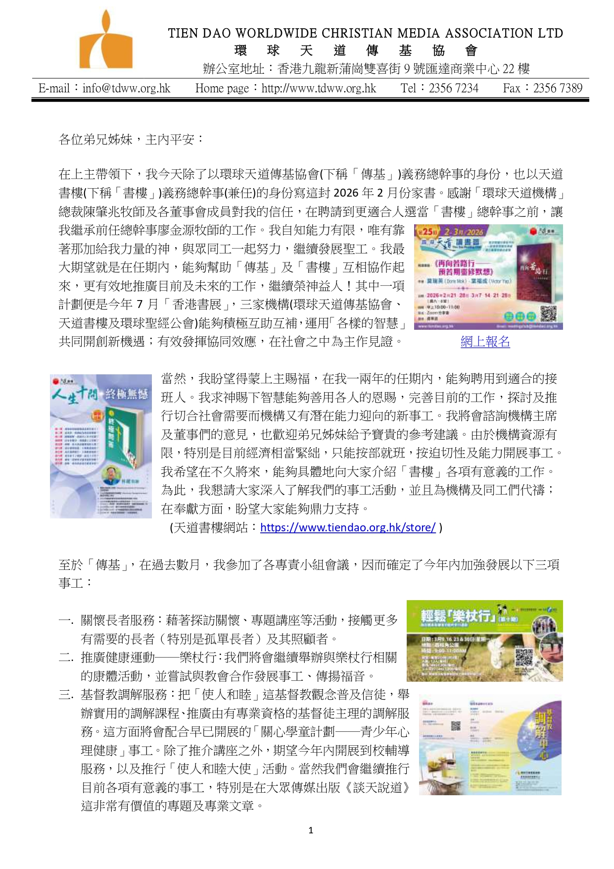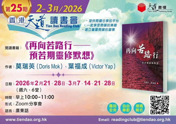 在上主帶領下,我今天除了以環球天道傳基協會(下稱「傳基」)義務總幹事的身份,也以天道書樓(下稱「書樓」)義務總幹事(兼任)的身份寫這封2026年2月份家書。感謝「環球天道機構」總裁陳肇兆牧師及各董事會成員對我的信任,在聘請到更適合人選當「書樓」總幹事之前,讓我繼承前任總幹事廖金源牧師的工作。我自知能力有限,唯有靠著那加給我力量的神,與眾同工一起努力,繼續發展聖工。我最大期望就是在任期內,能夠幫助「傳基」及「書樓」互相協作起來,更有效地推廣目前及未來的工作,繼續榮神益人!其中一項計劃便是今年7月「香港書展」,三家機構(環球天道傳基協會、天道書樓及環球聖經公會)能夠積極互助互補,運用「各樣的智慧」共同開創新機遇;有效發揮協同效應,在社會之中為主作見證。