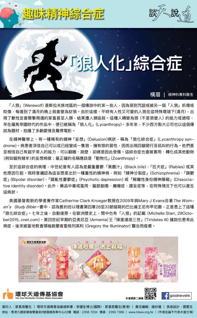 美國基督教新約學者兼作家Catherine Clark Kroeger教授在2009年與Mary J Evans 合著The Women’s Study Bible一書中,認為舊約但以理書第四章28至33節描寫的巴比倫王尼布甲尼撒,正是患上了這種「狼化綜合症」。七年之後,自動復原。在歐洲歷史上,間中也有「人狼」的記載 (Michelle Starr, 29October2015, cnet.com)。第四世紀早期的亞美尼亞(Armenia)王「梯里達底三世」(Tiridates III)據說也患有此病症,後來被當地教會領袖啟蒙者聖格列高利(Gregory the Illuminator)醫治而痊癒。