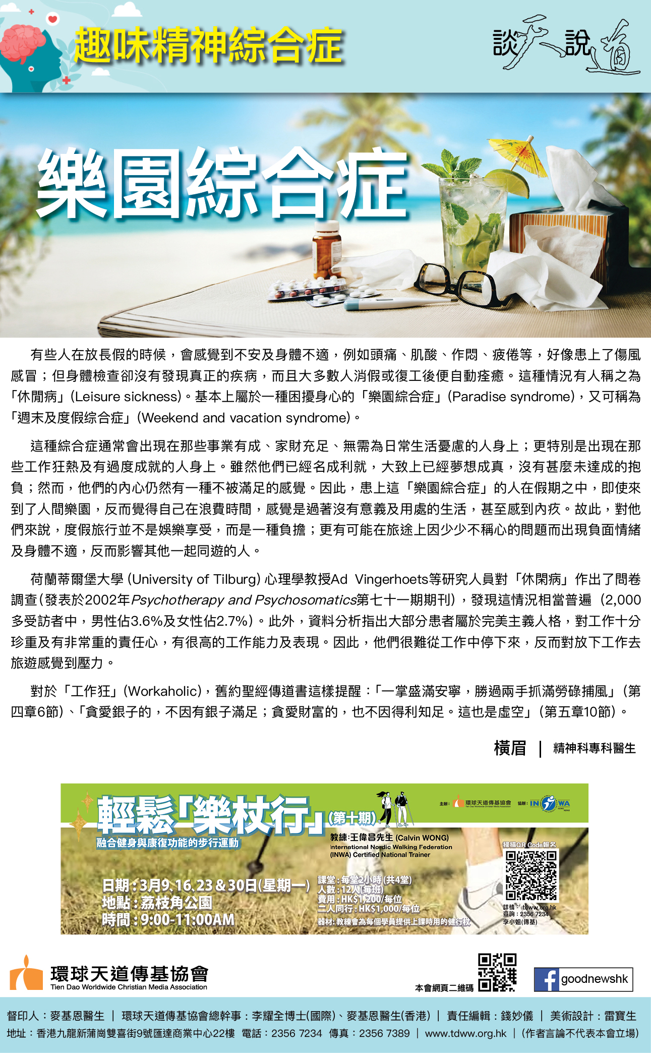 對於「工作狂」(Workaholic),舊約聖經傳道書這樣提醒:「一掌盛滿安寧,勝過兩手抓滿勞碌捕風」(第四章6節)、「貪愛銀子的,不因有銀子滿足;貪愛財富的,也不因得利知足。這也是虛空」(第五章10節)。