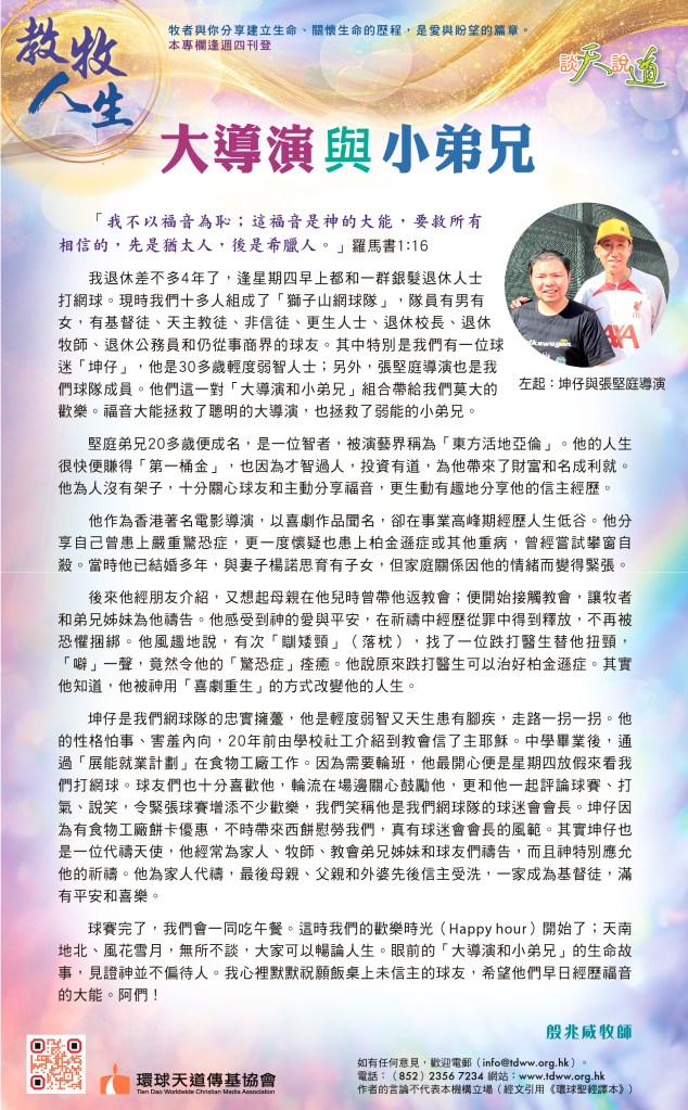 我退休差不多4年了,逢星期四早上都和一群銀髮退休人士打網球。現時我們十多人組成了「獅子山網球隊」,隊員有男有女,有基督徒、天主教徒、非信徒、更生人士、退休校長、退休牧師、退休公務員和仍從事商界的球友。其中特別是我們有一位球迷「坤仔」,他是30多歲輕度弱智人士;另外,張堅庭導演也是我們球隊成員。他們這一對「大導演和小弟兄」組合帶給我們莫大的歡樂。福音大能拯救了聰明的大導演,也拯救了弱能的小弟兄。