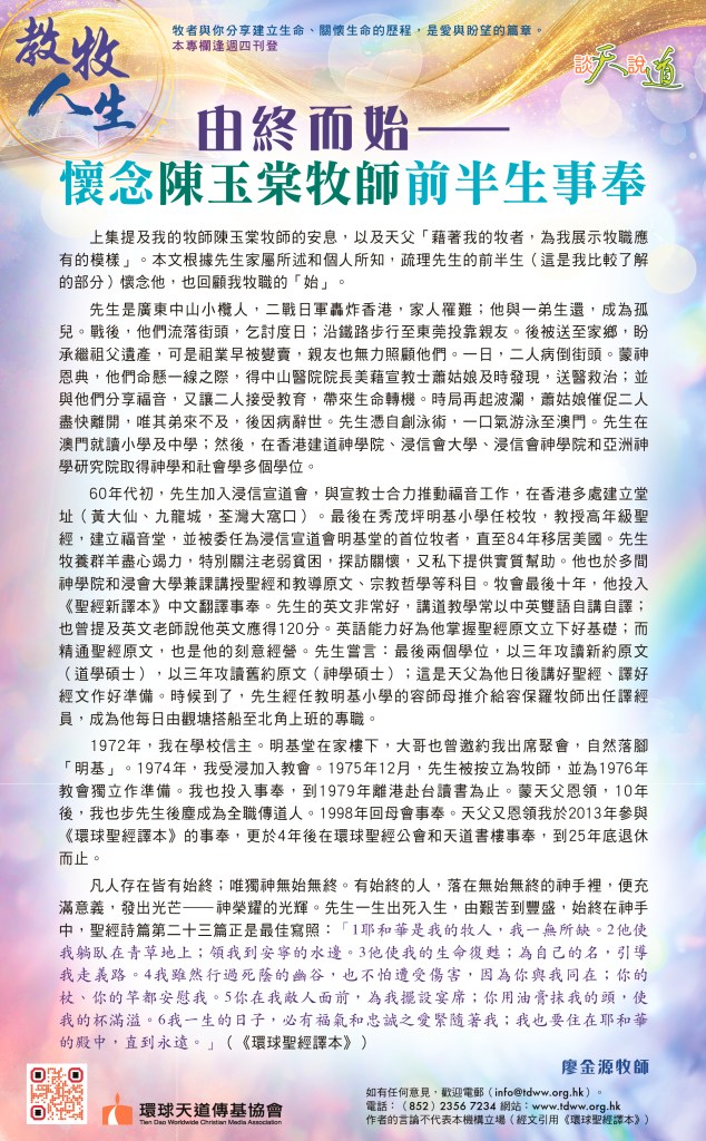 教牧人生:由終而始——懷念陳玉棠牧師前半生事奉
