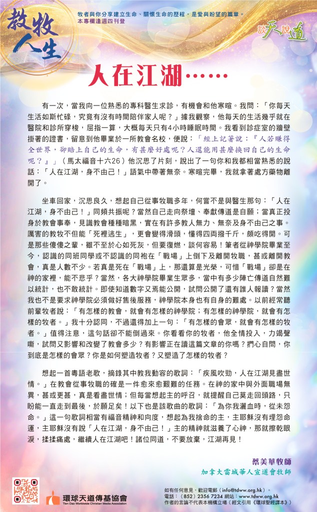 想起一首粵語老歌,摘錄其中教我動容的歌詞:「疾風吹勁,人在江湖見盡世情。」在教會從事牧職的確是一件愈來愈艱難的任務。在神的家中與外面職場無異,甚或更甚,真是看盡世情;但每當想起主的呼召,就提醒自己莫走回頭路,只盼能一直走到最後,於願足矣!以下也是該歌曲的歌詞:「為你我灑血時,從未怨命。」這一句歌詞相當有福音精神和向度,想起為我捨命的主,主耶穌沒有埋怨命運,主耶穌沒有說「人在江湖,身不由己!」主的精神就滋養了心神,那就擦乾眼淚,揉揉痛處,繼續人在江湖吧!諸位同道,不要放棄,江湖再見!