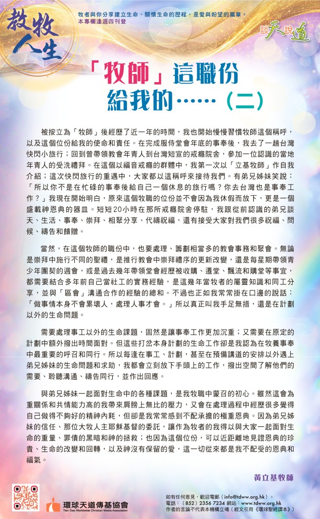 被按立為「牧師」後經歷了近一年的時間,我也開始慢慢習慣牧師這個稱呼,以及這個位份給我的使命和責任。在完成服侍堂會年底的事奉後,我去了一趟台灣快閃小旅行;回到曾帶領教會年青人到台灣短宣的戒癮院舍,參加一位認識的當地年青人的受洗禮拜。在這個以福音戒癮的群體中,我第一次以「立基牧師」作自我介紹;這次快閃旅行的重遇中,大家都以這稱呼來接待我們。有弟兄姊妹笑說:「所以你不是在忙碌的事奉後給自己一個休息的旅行嗎?你去台灣也是事奉工作?」我現在開始明白,原來這個牧職的位份並不會因為我休假而放下,更是一個盛載神恩典的器皿。短短20小時在那所戒癮院舍停駐,我跟從前認識的弟兄談天、生活、事奉、崇拜、相聚分享、代禱祝福,還有接受大家對我們很多祝福、問候、禱告和饋贈。