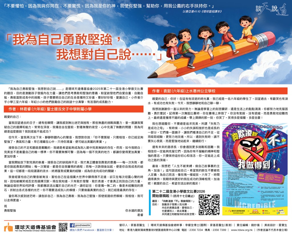 「我為自己勇敢堅強,我想對自己說……」是環球天道傳基協會2025年第二十一屆全港小學徵文比賽的題目,目的是激勵孩子發掘內在力量,讓他們思考勇敢和堅強的意義,盼望啟發他們自愛自重、自勵自勉,勇敢面對成長中的挑戰。孩子需要明白自己的生命是獨特又珍貴,要好好珍惜、愛護自己。小作者介乎小學三至六年級,年紀小小的他們鼓勵自己的說話十分真摰,有活潑的成長動力。