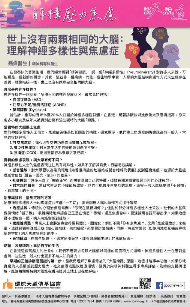 在香港這個高壓力的社會中,我們不應要求每顆大腦都以同樣的速度和方式運轉。神經多樣性人士在應對焦慮時,往往比一般人付出更多不為人知的努力。