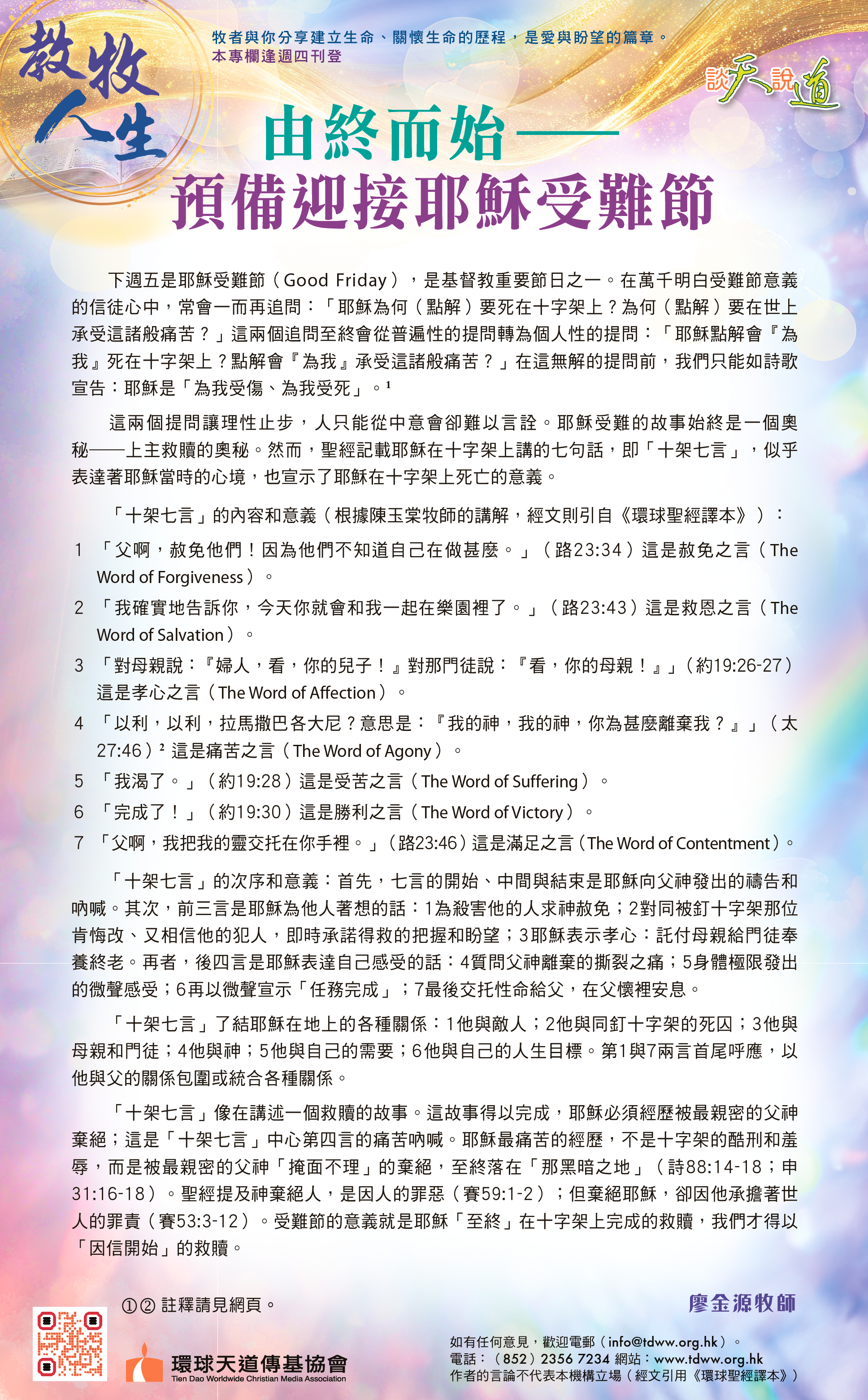 「十架七言」的內容和意義(根據陳玉棠牧師的講解,經文則引自《環球聖經譯本》):