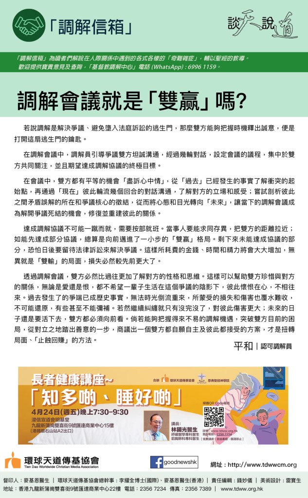 在會議中,雙方都有平等的機會「盡訴心中情」,從「過去」已經發生的事實了解衝突的起始點,再通過「現在」彼此輪流幾個回合的對話溝通,了解對方的立場和感受;嘗試剖析彼此之間矛盾誤解的所在和爭議核心的徵結,從而將心態和目光轉向「未來」,讓當下的調解會議成為解開爭議死結的機會,修復並重建彼此的關係。