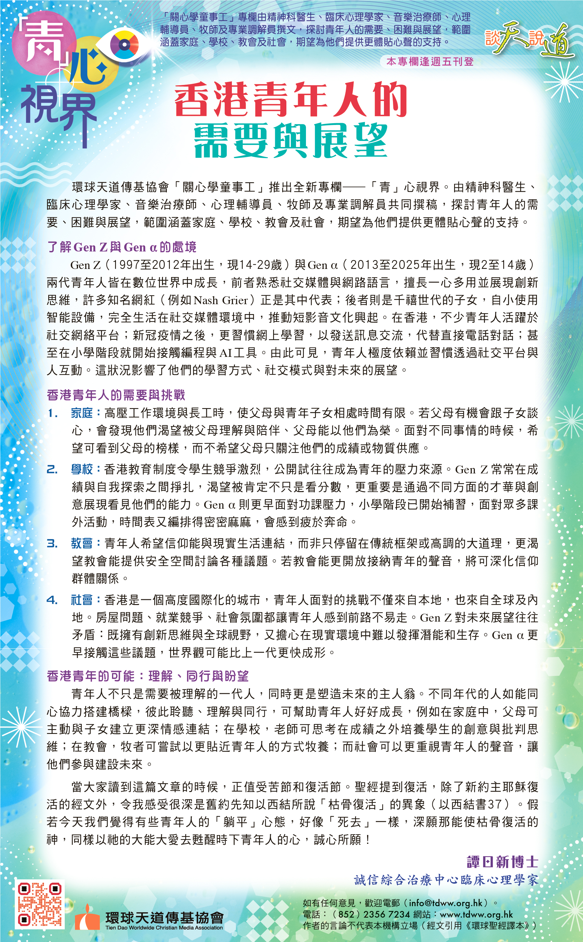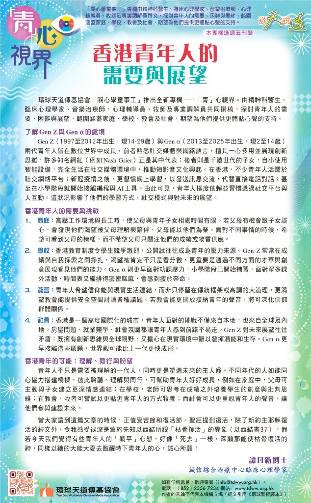 環球天道傳基協會「關心學童事工」推出全新專欄——「青」心視界。由精神科醫生、臨床心理學家、音樂治療師、心理輔導員、牧師及專業調解員共同撰稿,探討青年人的需要、困難與展望,範圍涵蓋家庭、學校、教會及社會,期望為他們提供更體貼心聲的支持。