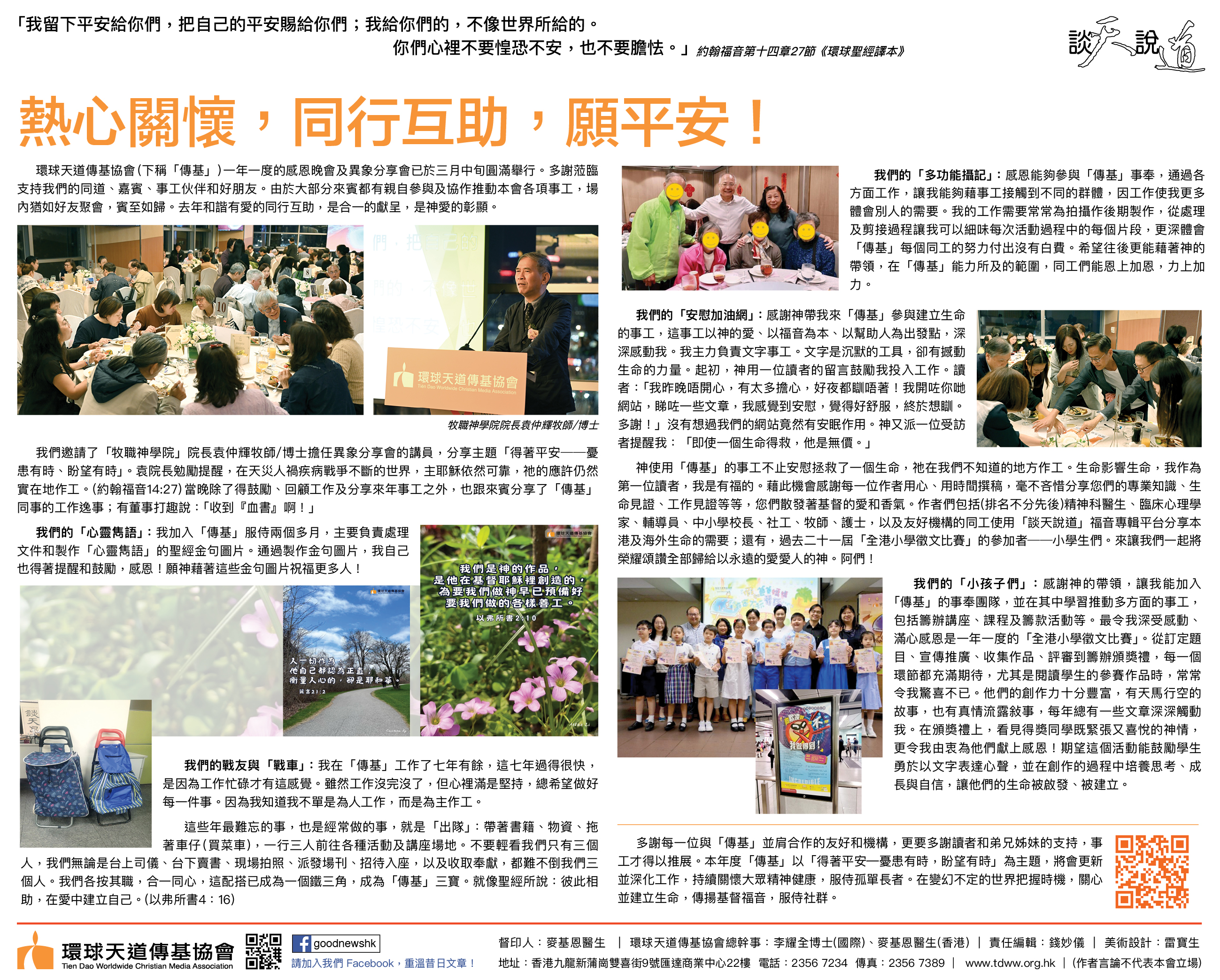 多謝每一位與「傳基」並肩合作的友好和機構,更要多謝讀者和弟兄姊妹的支持,事工才得以推展。本年度「傳基」以「得著平安—憂患有時,盼望有時」為主題,將會更新並深化工作,持續關懷大眾精神健康,服侍孤單長者。在變幻不定的世界把握時機,關心並建立生命,傳揚基督福音,服侍社群。