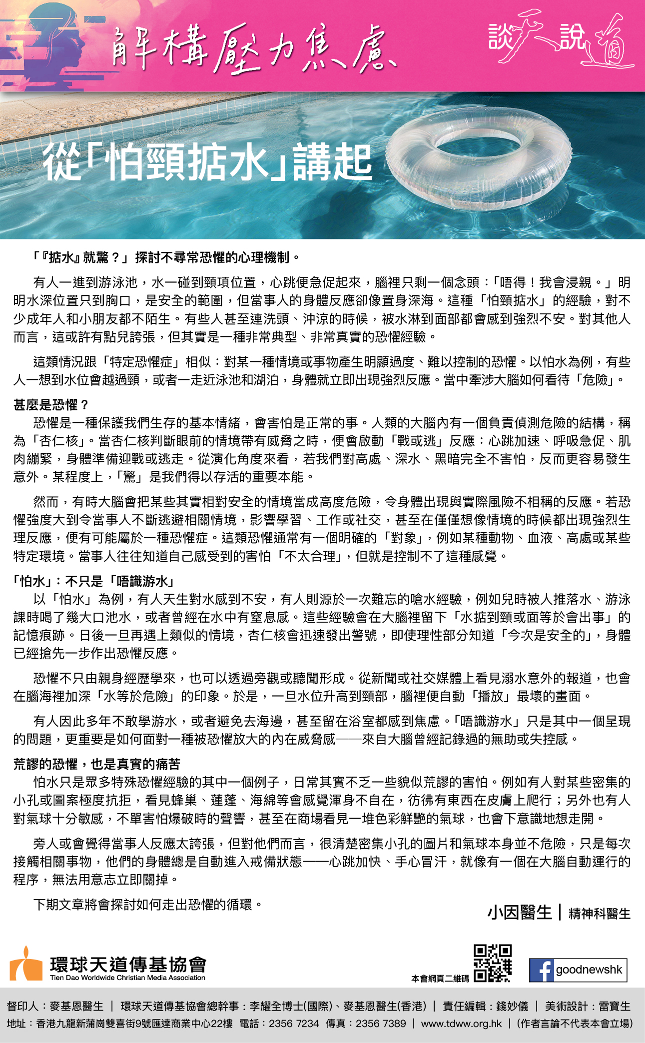有人一進到游泳池,水一碰到頸項位置,心跳便急促起來,腦裡只剩一個念頭:「唔得!我會浸親。」明明水深位置只到胸口,是安全的範圍,但當事人的身體反應卻像置身深海。這種「怕頸掂水」的經驗,對不少成年人和小朋友都不陌生。有些人甚至連洗頭、沖涼的時候,被水淋到面部都會感到強烈不安。對其他人而言,這或許有點兒誇張,但其實是一種非常典型、非常真實的恐懼經驗。