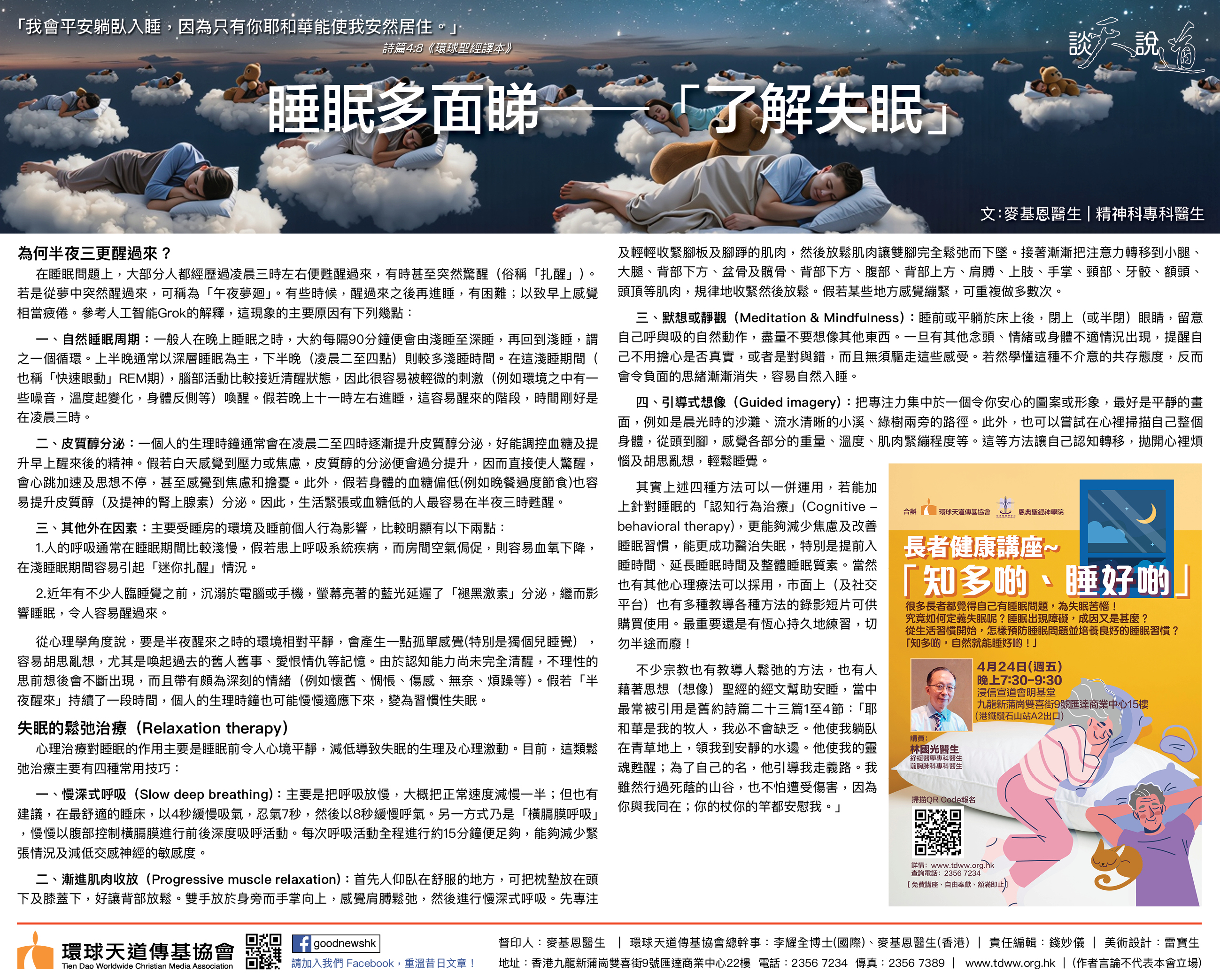 四、引導式想像(Guided imagery):把專注力集中於一個令你安心的圖案或形象,最好是平靜的畫面,例如是晨光時的沙灘、流水清晰的小溪、綠樹兩旁的路徑。此外,也可以嘗試在心裡掃描自己整個身體,從頭到腳,感覺各部分的重量、溫度、肌肉緊繃程度等。這等方法讓自己認知轉移,拋開心裡煩惱及胡思亂想,輕鬆睡覺。