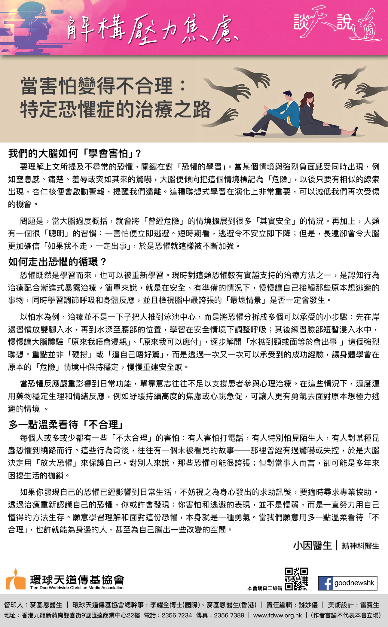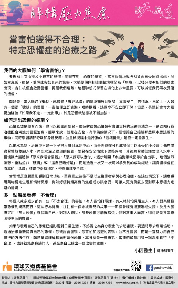 如果你發現自己的恐懼已經影響到日常生活,不妨視之為身心發出的求助訊號,要適時尋求專業協助。透過治療重新認識自己的恐懼,你或許會發現:你害怕和逃避的表現,並不是懦弱,而是一直努力用自己懂得的方法生存。願意學習理解和面對這份恐懼,本身就是一種勇氣。當我們願意用多一點溫柔看待「不合理」,也許就能為身邊的人,甚至為自己騰出一些改變的空間。