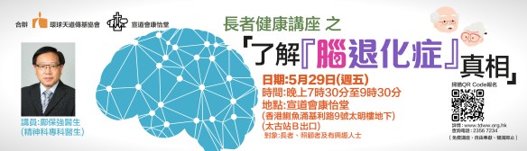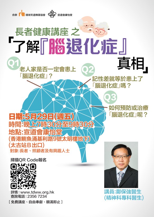 長者健康講座 之 「了解『腦退化症』真相」 Posted on 2026 年 04 月 14 日 by tdwwhk Q1﹕老人家是否一定會患上「腦退化症」?Q2﹕記性差就等於患上「腦退化症」嗎?Q3﹕如何預防或治療「腦退化症」呢? 網上報名 講員﹕鄺保強醫生 | 精神科專科醫生 日期﹕5月29日(週五)時間﹕晚上7時30分至9時30分地點﹕宣道會康怡堂 香港鰂魚涌基利路9號太明樓地下 (太古站B出口) 對象 : 長者、照顧者及有興趣人士 免費講座 | 自由奉獻 | 額滿即止 合 辦:環球天道傳基協會 ‧ 宣道會康怡堂 分享此文: 分享到 WhatsApp(在新視窗中開啟) WhatsApp Tweet 以電子郵件將連結傳送給朋友(在新視窗中開啟) 電子郵件 喜歡 正在載入...