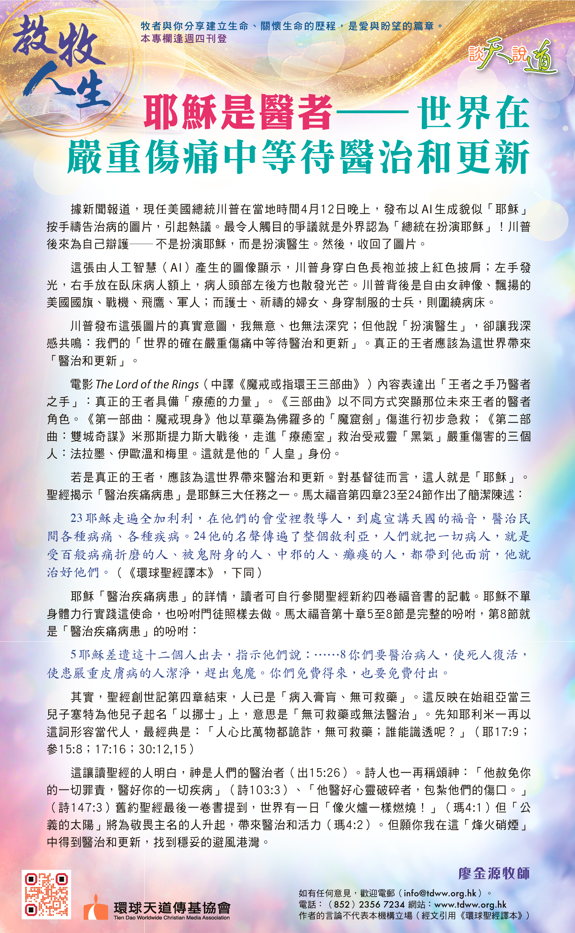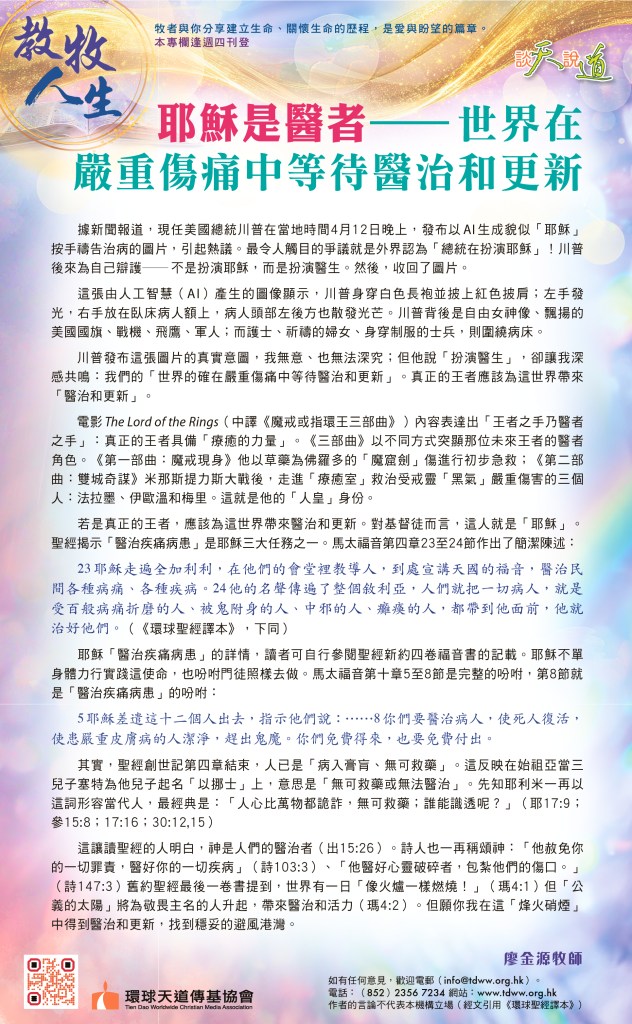 川普發布這張圖片的真實意圖,我無意、也無法深究;但他說「扮演醫生」,卻讓我深感共鳴:我們的「世界的確在嚴重傷痛中等待醫治和更新」。真正的王者應該為這世界帶來「醫治和更新」。