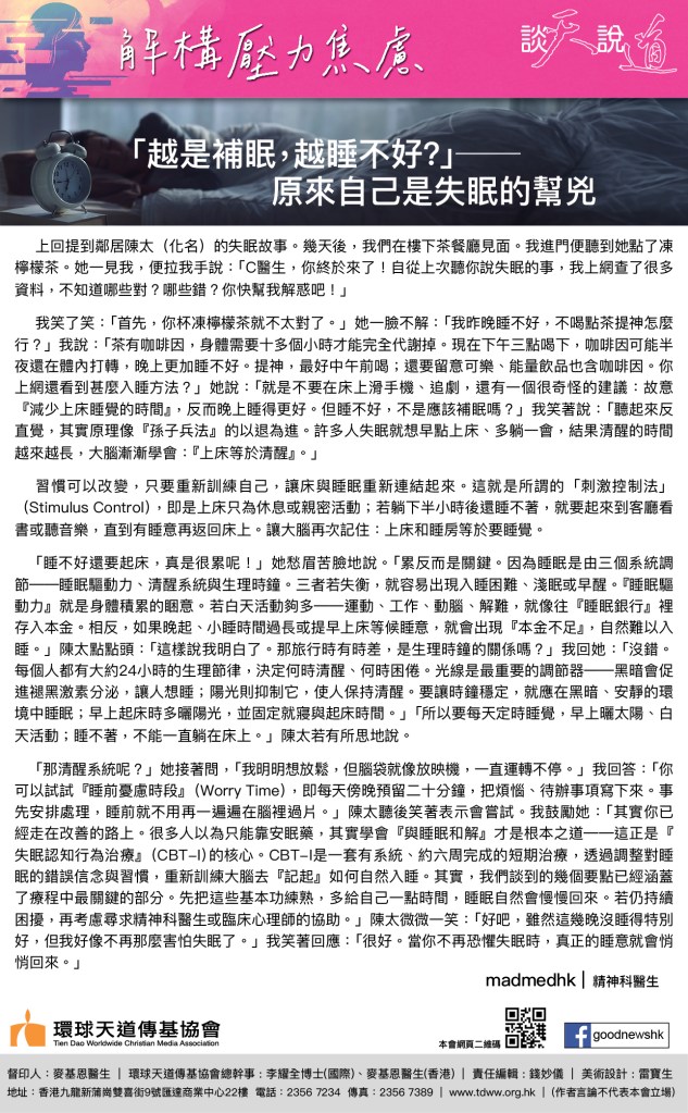我笑了笑:「首先,你杯凍檸檬茶就不太對了。」她一臉不解:「我昨晚睡不好,不喝點茶提神怎麼行?」我說:「茶有咖啡因,身體需要十多個小時才能完全代謝掉。現在下午三點喝下,咖啡因可能半夜還在體內打轉,晚上更加睡不好。提神,最好中午前喝;還要留意可樂、能量飲品也含咖啡因。你上網還看到甚麼入睡方法?」她說:「就是不要在床上滑手機、追劇,還有一個很奇怪的建議:故意『減少上床睡覺的時間』,反而晚上睡得更好。但睡不好,不是應該補眠嗎?」我笑著說:「聽起來反直覺,其實原理像『孫子兵法』的以退為進。許多人失眠就想早點上床、多躺一會,結果清醒的時間越來越長,大腦漸漸學會:『上床等於清醒』。」