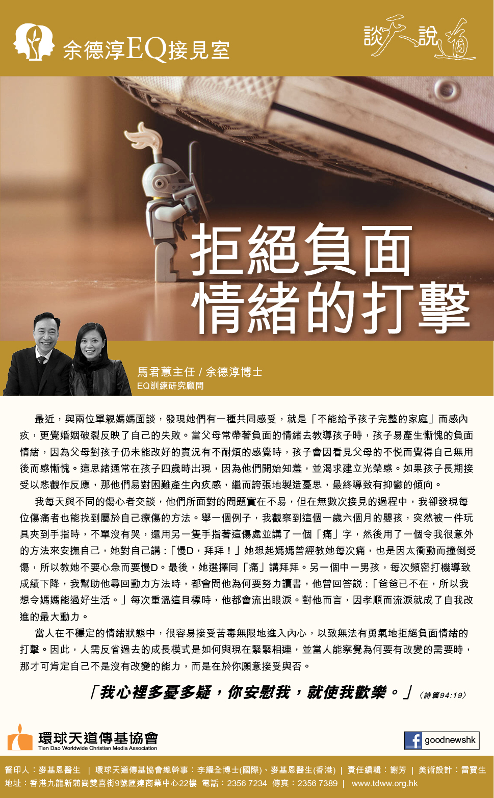 EQ是一種生活的風格,影響人的關係和「生活質素」,當人能懂得在適當的時間,選擇做適當的事,那就能減少不必要的負面情緒。有些人如童年時已習慣地自我憎恨,以及在兒童期過多依附母親,這也導致他們甚少用左腦作分析而選擇相信自己注定是失敗者。久而久之,他們所累積的「負面情緒」若缺乏智慧去處理,漸漸地變為「破壞性情緒」及難以改變的「情緒路徑」,即當他/她遇上逆境時,他/她會習慣性地以「憂」成抑鬱、「焦」慮成神經質、「怒」成敵意作回應。因此,我常勸導家長不要過分保護孩子免受失敗之痛,因人要學習面對生命每天都會有負面情緒,但卻鼓勵他們在過程中享受成長比解決問題更重要的道理。