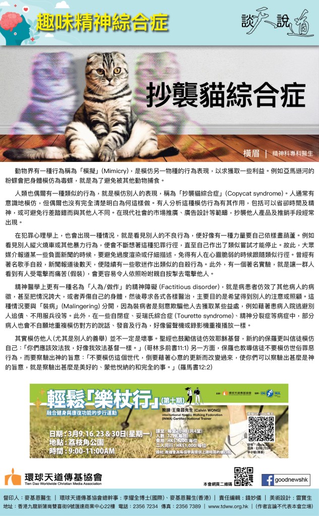 精神醫學上更有一種名為「人為/做作」的精神障礙(Factitious disorder),就是病患者仿效了其他病人的病徵,甚至把情況誇大,或者弄傷自己的身體,然後尋求各式各樣醫治,主要目的是希望得到別人的注意或照顧。這種情況要與「裝病」(Malingering)分開,因為裝病者是刻意欺騙他人去獲取某些益處,例如藉著患病入院逃避別人追債、不用服兵役等。此外,在一些自閉症、妥瑞氏綜合症(Tourette syndrome)、精神分裂症等病症中,部分病人也會不自願地重複模仿對方的說話、發音及行為,好像留聲機或錄影機重複播放一樣。