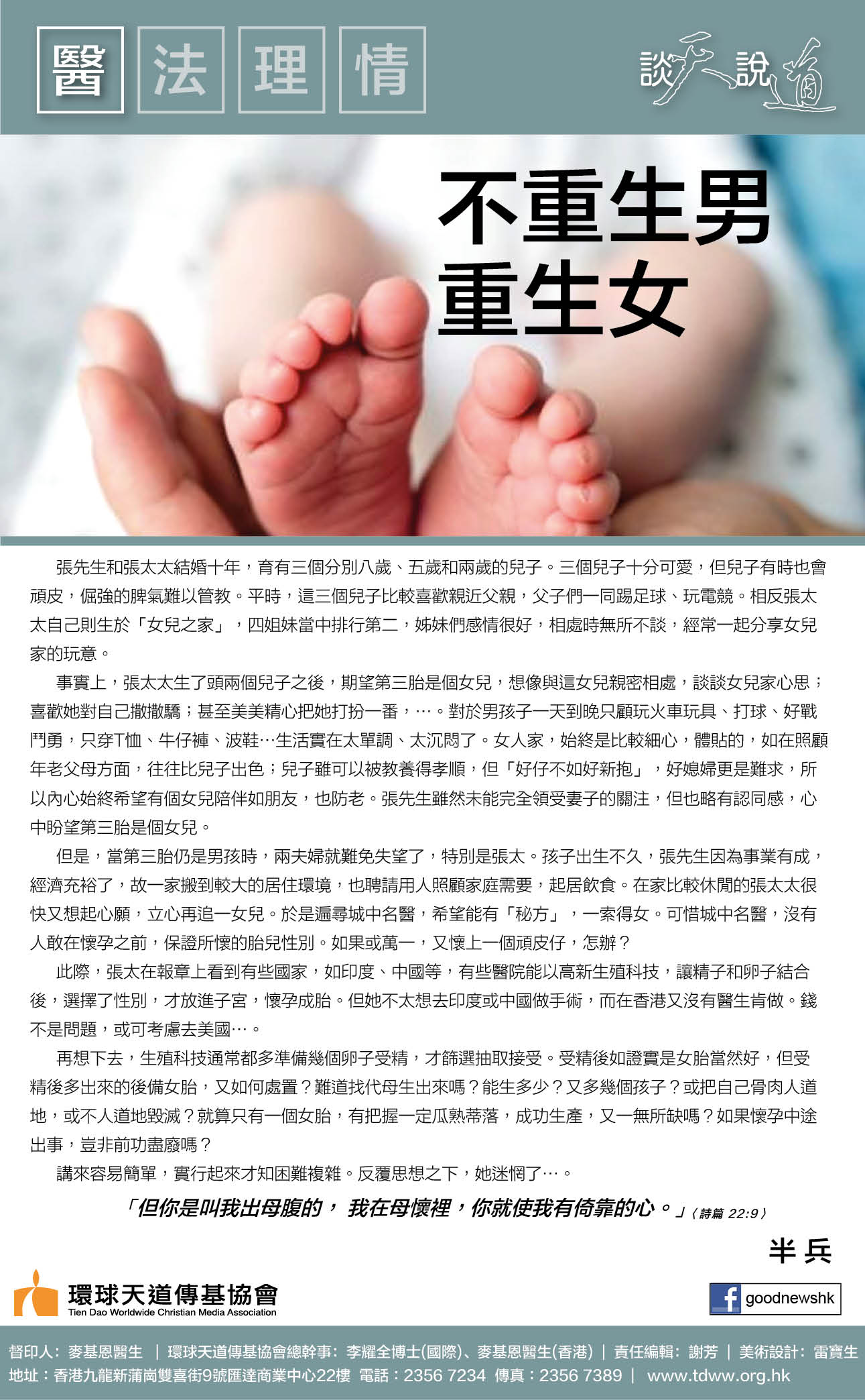 在高舉自由、民主的普世價值觀念下,人們渴望在生活各方面都有選擇的權利是可以被理解;對於生兒育女這人生大事,當然希望能盡一切努力來選擇自己喜歡的,例如嬰兒何時出生、自然或剖腹分娩、生男或生女,甚至不久將來能以基因改造來孕育出具有某些特質的嬰兒。現今科技的發展能讓我們有更多機會選擇,甚至朝向人類嘗試掌控大自然這方向;而權力及金錢能給予一些人有更大的選擇權,但值得我們深思的卻是這任意選擇背後的道德問題。