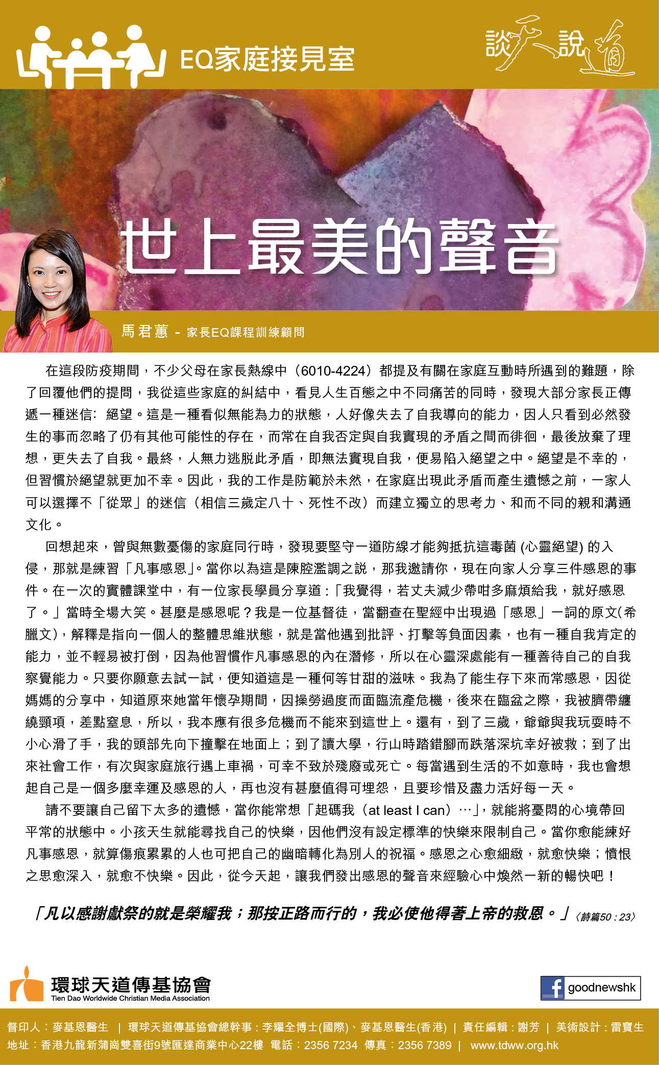 這是一種多麼恐怖的詛咒,如你能察覺自己有自我責備的傾向,如常覺得自己做得不夠好便全力以赴地去做,但當對方皺眉頭就以為在批評自己的不是,那我建議你每一日集中做好一個練習,就是每天問自己﹕「今日有甚麼值得欣賞自己的事?」自從疫情需搬回家以照顧父母(已近6個月了),我每天也決心與媽媽做一個「換心手術」練習(從石心到肉心),就是培養她有一顆自愛的心。媽媽很年輕時便放棄學業到工廠做女工幫補家計,但工作不夠數年便嫁給一個素未謀面的男人,是外婆透過「媒人婆」介紹的。她因著愚孝放棄了自己的夢想及興趣,如此也改變了一生。我終於明白,媽媽的腦海中為何甚少以正面的角度來看待自己及別人,因她數十年都被困在苦毒及鬱結中。