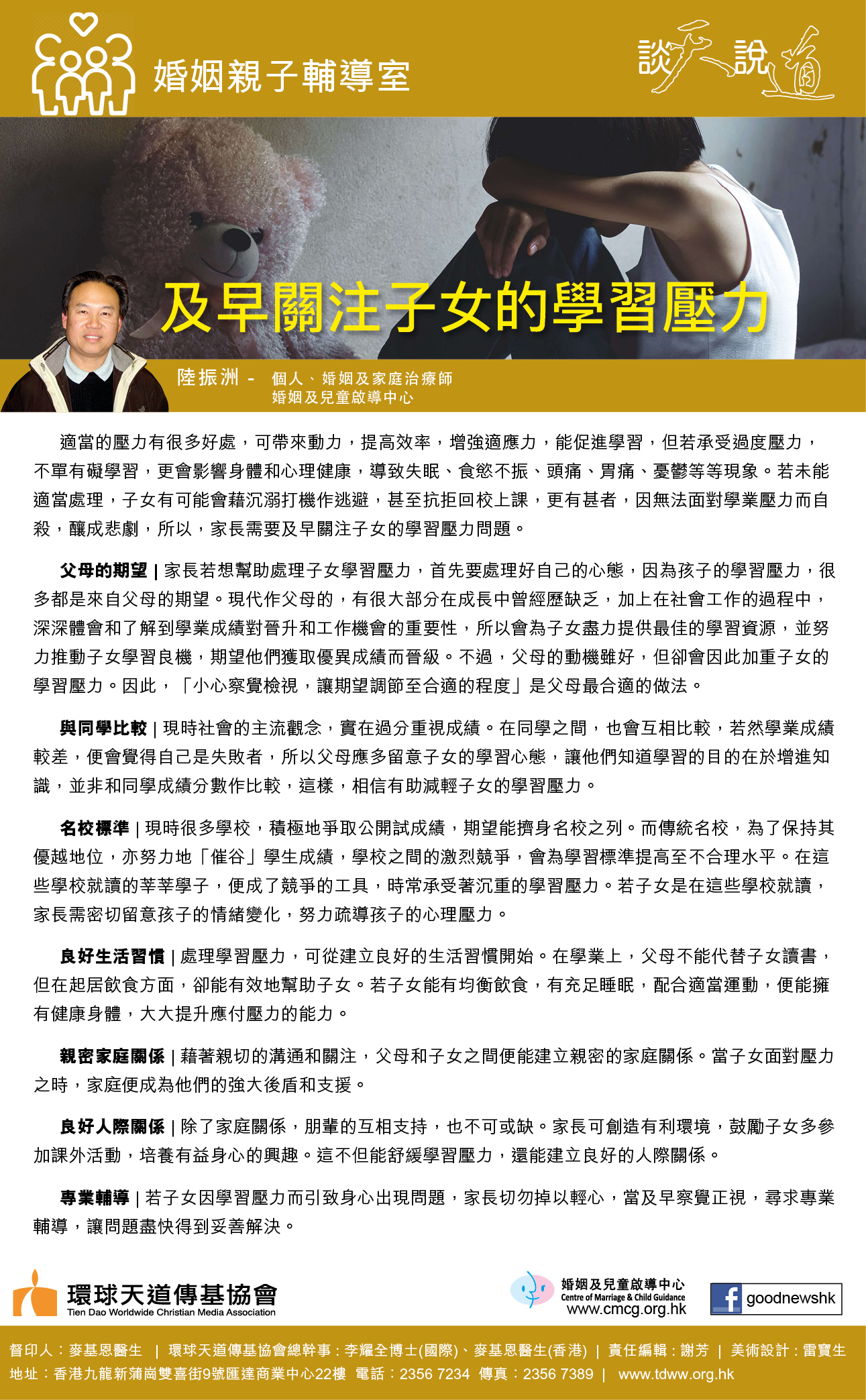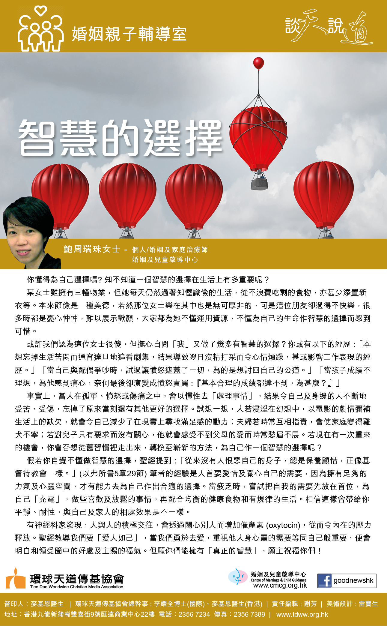 於是,我決心每晚按時領媽媽研讀一節聖經,因深信在聖經中隨時能找到帶積極力量的字眼;同時也邀請她回想當天值得自我欣賞的事,可能起初真的找不到,因她以為那些事屬於應該去做的行為,所以我說出自己對她的欣賞是甚麼。一個月後的某一天,媽媽微笑地對我說﹕「我真的不懂愛惜自己,以為搏命付出就會令人開心,但如果對方有不滿,我的心情又立即變得很壞,這又何苦呢!怪不得我常感到心情沉重,輕鬆不來。但現在,我會尊重自己的能力有限及欣賞自己的盡責,這樣選擇讓自己活得輕鬆自在一些。」我聽後感動得落淚,並立即按著媽媽的手一起禱告。