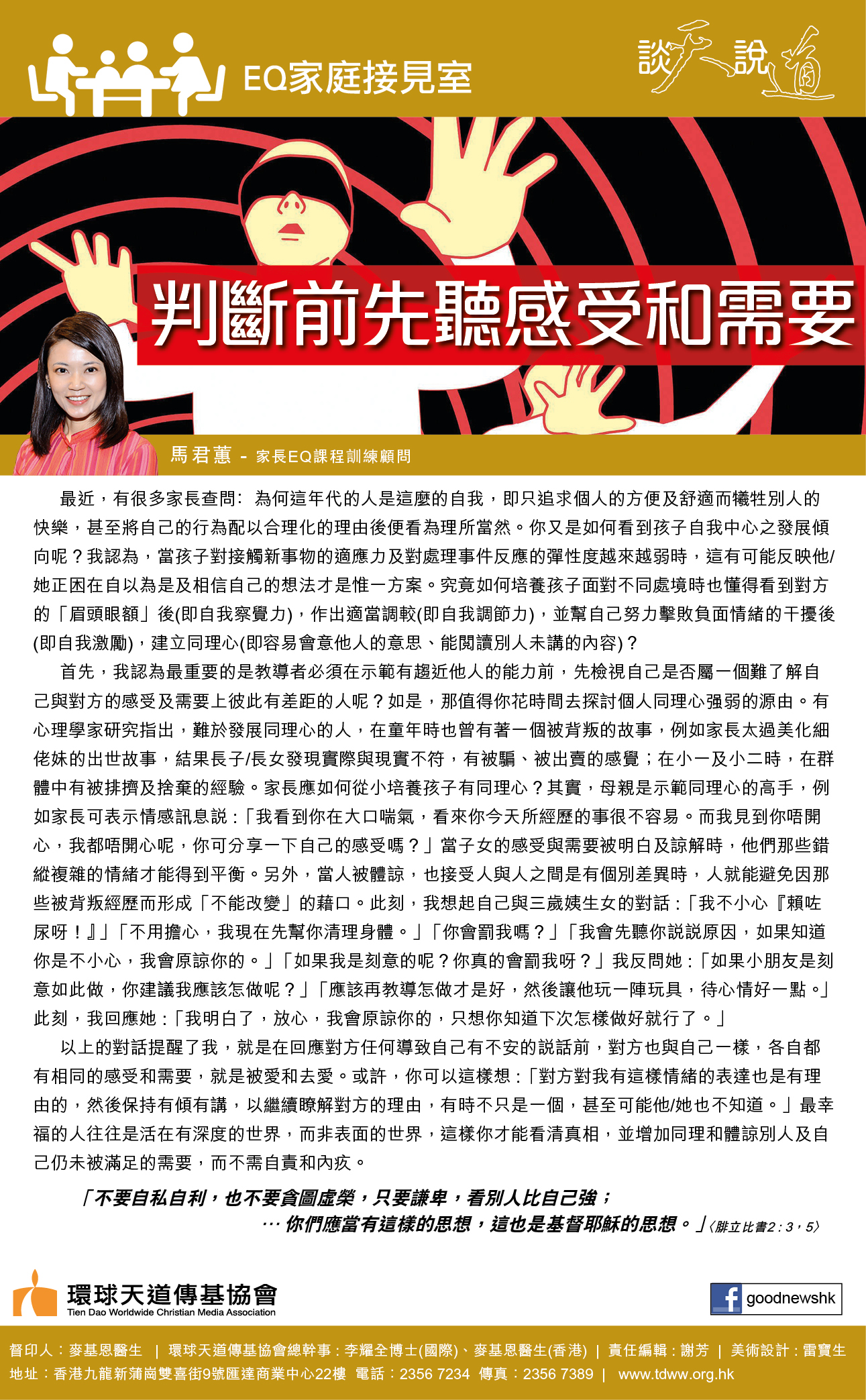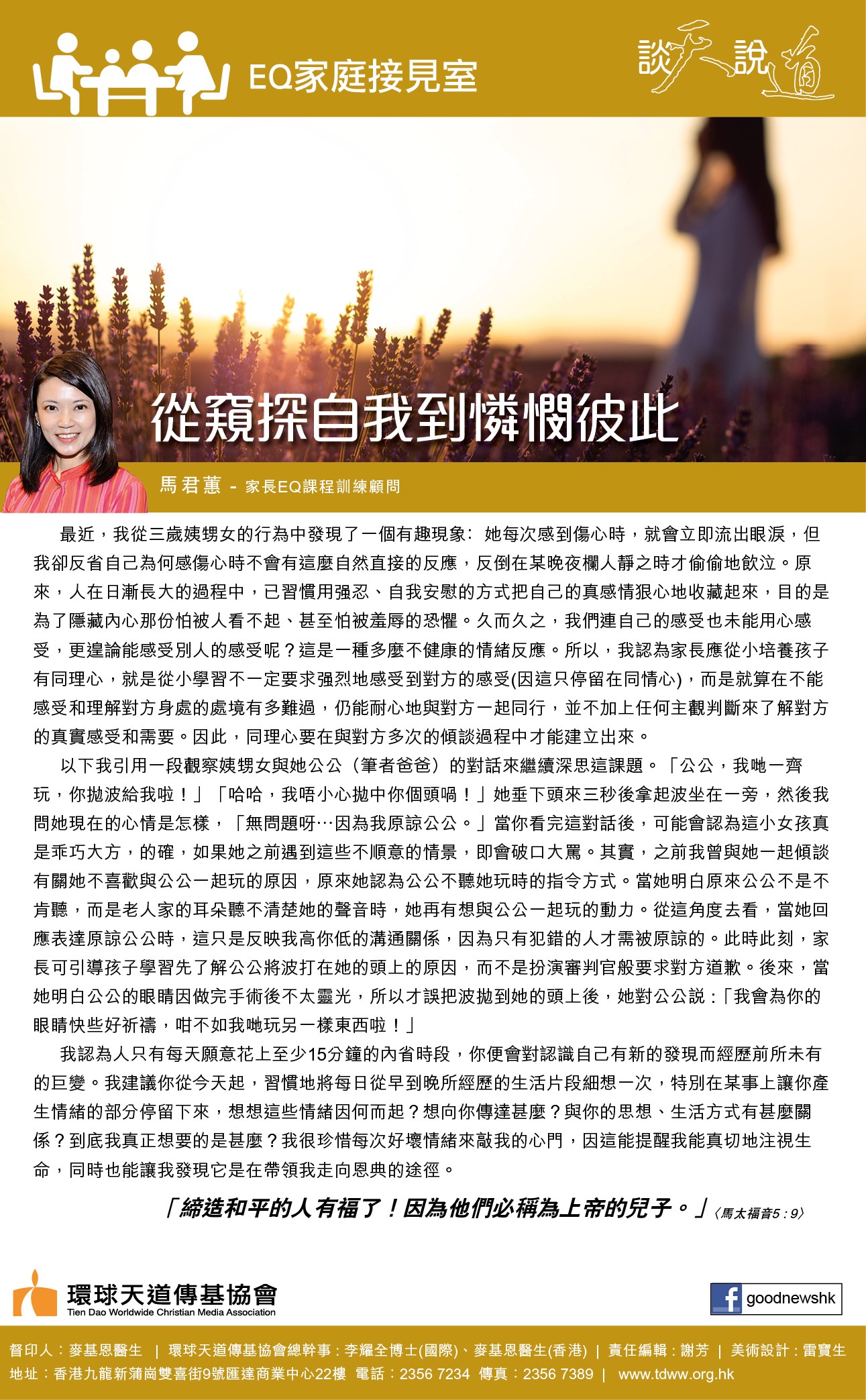 最近,我聽到媽媽對致電來的朋友勸導說﹕「不要冒險外出飲茶、拒絕一些聯誼活動、不要貪方便就不做足家居防疫。」當你做每一個反應選擇時(惡言相待,抑或以善勝惡),可想想自己原本所作的行為是為了滿足自己甚麼需要。這樣,當你能真正地擁抱全部的自己,及了解自己在每個行動背後的動機和需要時,你會對己對人也可展現一份善意。我鼓勵如正處於情緒糾結中的你,與我一起做以上的省察練習,最後你會收到意想不到的結果。前天,媽媽對我說﹕ 「唱粵曲的老師想約我於4月底一起出來練歌,但我回應說要與女兒商量後才回覆她。但其實我心中有數,現想想如何拒絕她。我認為在家中最安全,因有你在家就確保一切安全。」我感動落淚,因我一直以來所堅持這「有傾有講」的溝通關係,不是白費的了。