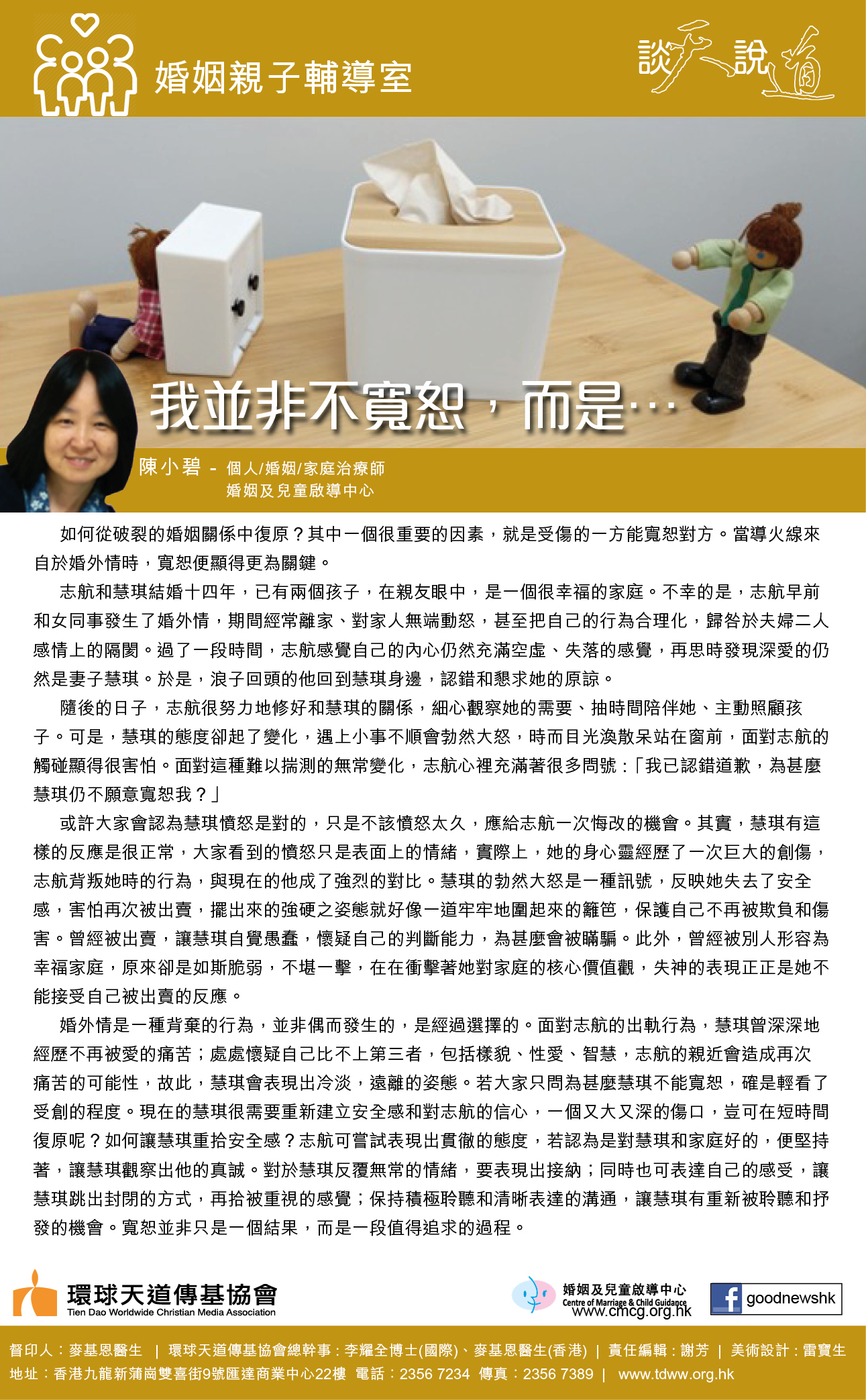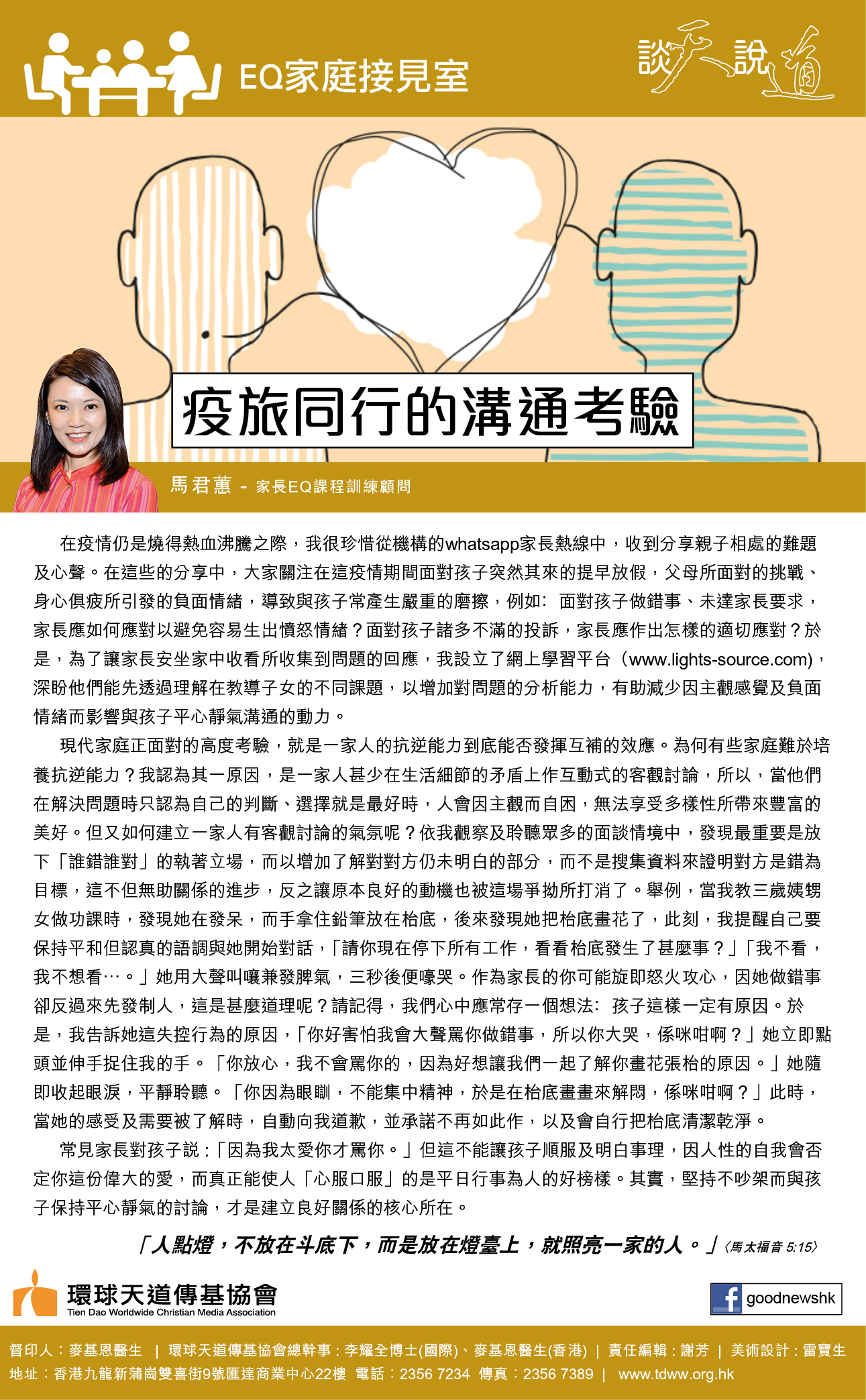 在過去近兩個月搬回父母家中同住,原因在這嚴峻的疫情期間,需要提醒兩老如何做好家居防疫的清潔程序及提升個人保護的意識。起初,我以為依足新聞報道指引,並做好一個社會公民應有的責任,就是必然正確的事,但我的確輕看了父母對防疫意識的抗拒程度。「甚麼都要防,從外面返到家中,又要換衫洗澡、又要用消毒火酒逐件物品抹乾淨,我怕你變成神經質的人,而我心情也被你整到心煩。」當聽到媽媽如此發脾氣的說話,我的內心既憤怒又悲傷,曾自責真無用,將原本出自好意的動機也弄致家人埋怨及曲解原意。後來,我想起自己曾提醒家長們,當有負面情緒來到時,就要正地正視它,因這可以是一份成長大禮。於是,我開始省察及思索自己在家中所做的一連串舉動滿足了自己甚麼需要。這時,我才發現照顧好家人,並顧及家人的需要,對我來說是多麼重要的事;自己認真且確定地執行家居防疫,也是為了滿足照顧好家人的需要。當我想到這裡時,我便不再負面地自責,反之頓然改變了自己的心態,因我發現了一些在沒有任何負面情緒干擾下對自己有了新了解,就是需要疼惜自我及善待自己。因此,如果當你正面對與家人有不如意的溝通,倒不如選擇停止一味自責,或是指責別人的方式,而多意識到自己所作的真正動機及需要是甚麼。當我調教好自己的心態,就是我做一件事不是基於責任、歉疚、恐懼,而是為了讓自己和對方的生命變得更好。自始,我選擇每天也與父母一起收看新聞,在旁耐心地解釋報道的訊息及醫生發放的資料、鼓勵她在家中唱粵曲消磨時間,減低沉悶(像坐監)的感覺;在睡前(心情平靜的時刻)與媽媽一起聊聊當天的感受及彼此的真正想法。