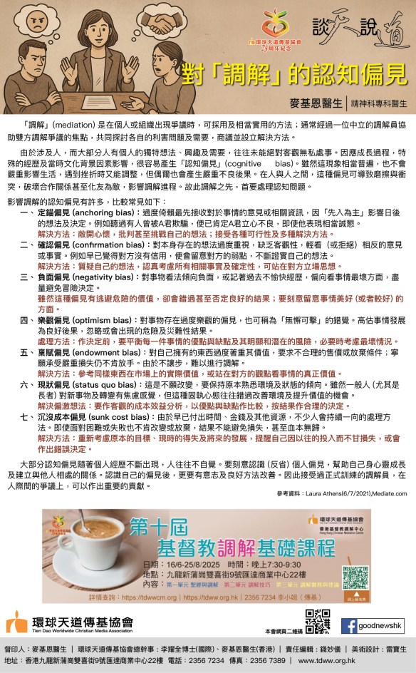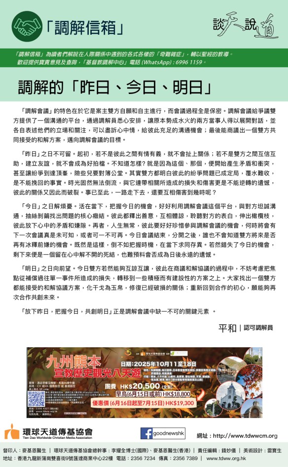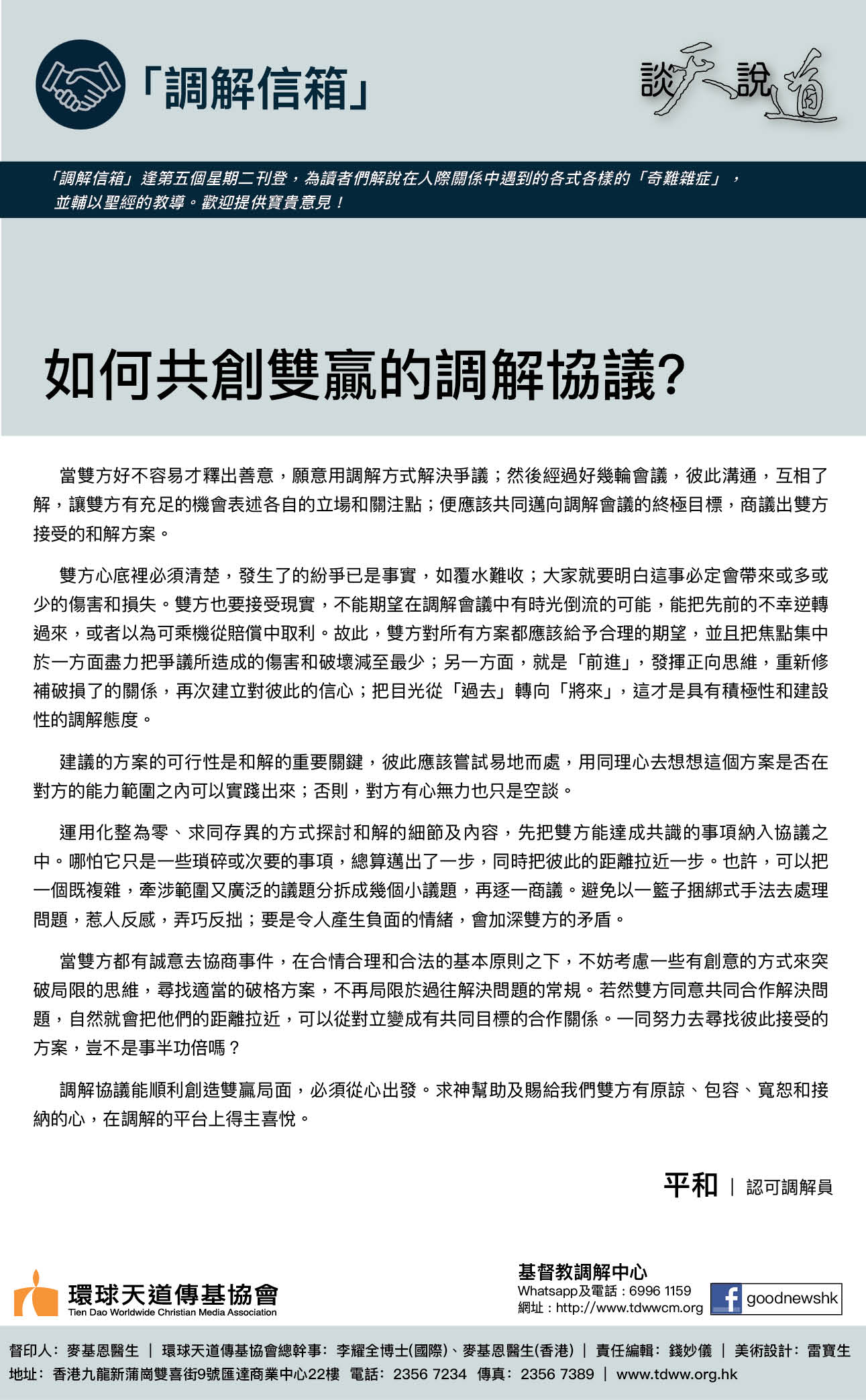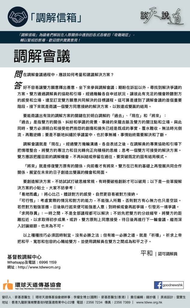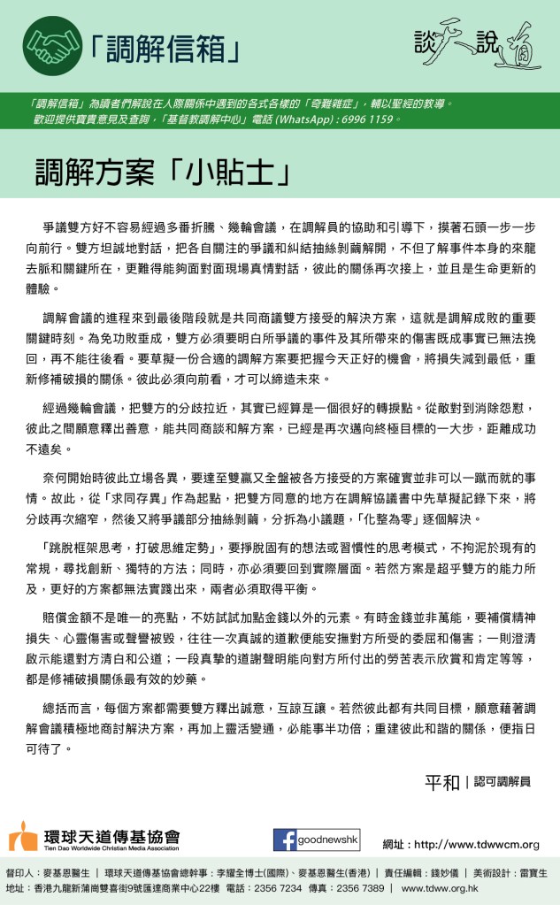 總括而言,每個方案都需要雙方釋出誠意,互諒互讓。若然彼此都有共同目標,願意藉著調解會議積極地商討解決方案,再加上靈活變通,必能事半功倍;重建彼此和諧的關係,便指日可待了。