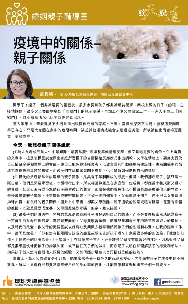 (3) 父母常在身邊作支持﹕青少年的內心深處希望父母可以求援,但同時,他們又認為父母無暇理會他們,即使有時間亦不會真正瞭解他們的難處,所以傾向不與父母分享。故此,讓青少年知道自己是父母的優先,父母隨時樂意提供支援是最重要的。