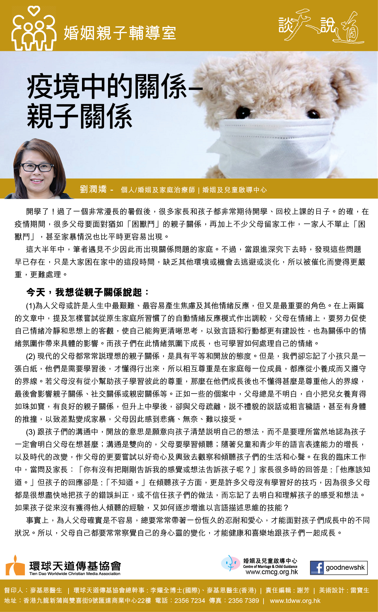 (3) 父母常在身邊作支持﹕青少年的內心深處希望父母可以求援,但同時,他們又認為父母無暇理會他們,即使有時間亦不會真正瞭解他們的難處,所以傾向不與父母分享。故此,讓青少年知道自己是父母的優先,父母隨時樂意提供支援是最重要的。