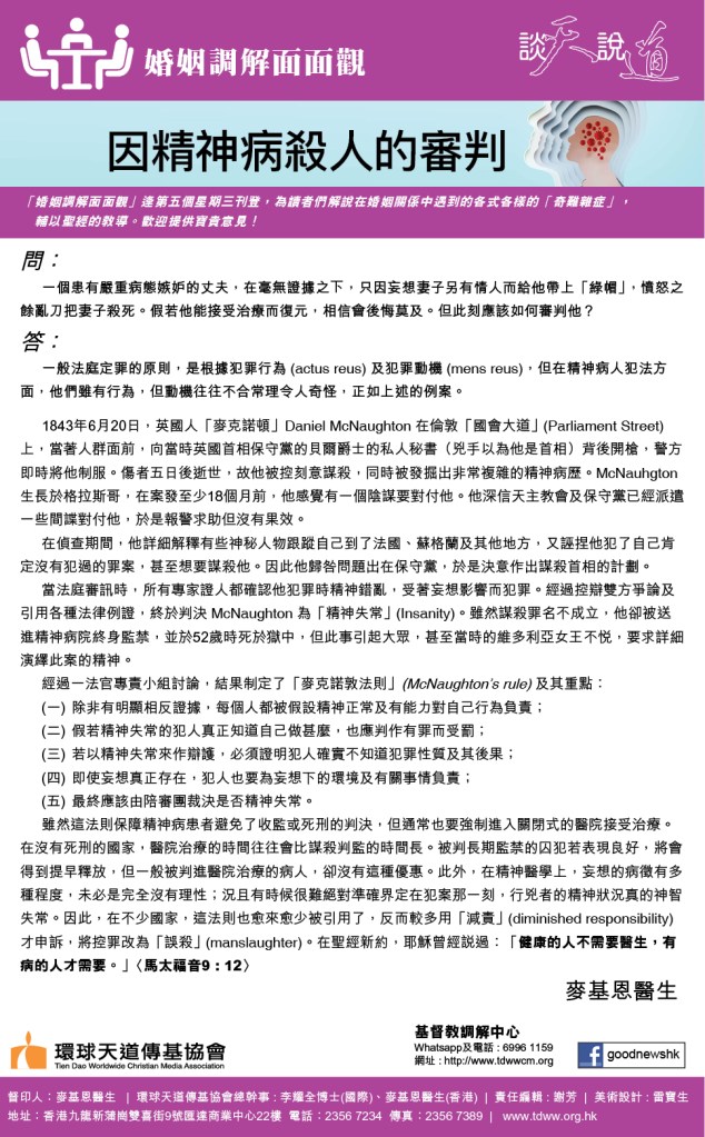 一般法庭定罪的原則,是根據犯罪行為(actus reus)及犯罪動機(mens reus),但在精神病人犯法方面,他們雖有行為,但動機往往不合常理令人奇怪,正如上述的例案。