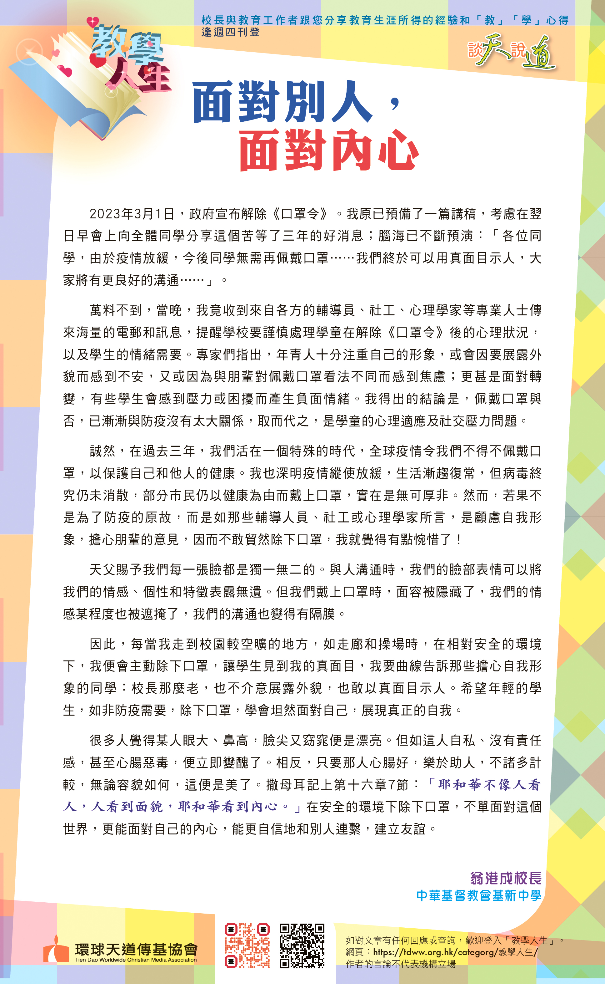 作為教育界的一分子,我們要有教學相長,虛心學習的心態。作為人師,我們很容易在不斷教導學生的同時,忘記了自己也要接受主耶穌的教導。聖經中帶領以色列人出埃及的領袖摩西,曾這樣向神禱告:「求你教導我們數算自己的日子,好使我們得到智慧的心!」(詩篇90:12)當我們曉得「怎樣數算自己的日子」,我們就能得著「智慧的心」。教導孩子,除了花時間、用耐性,絕對需要智慧。學校的老師的確每天要面對繁重的教擔及各樣的行政工作,但都不能忘記還要多花一點時間投資在孩子的生命培育上,聽聽他們的「心」;或許,在千鈞一髮之際,我們就換回了一條生命。