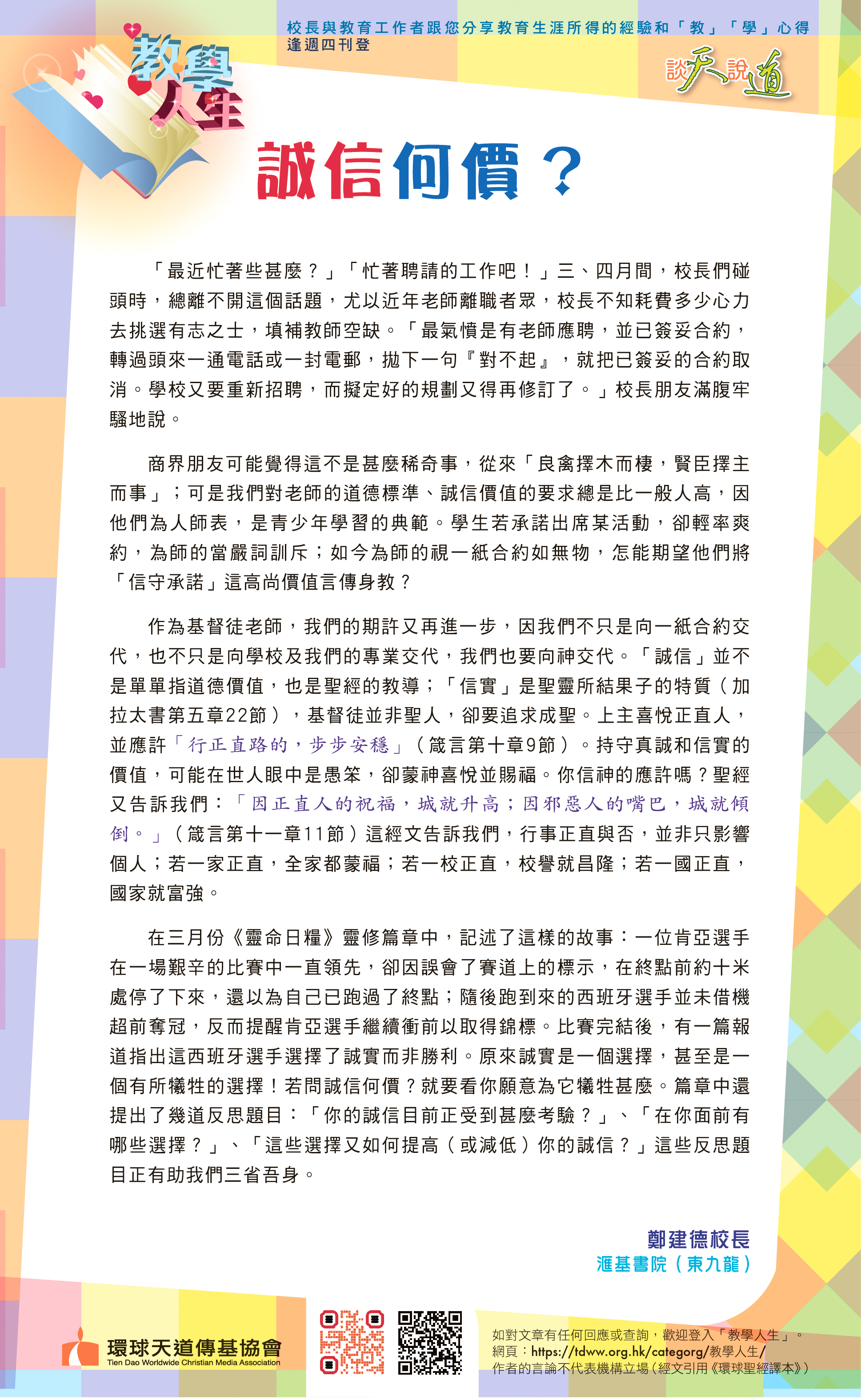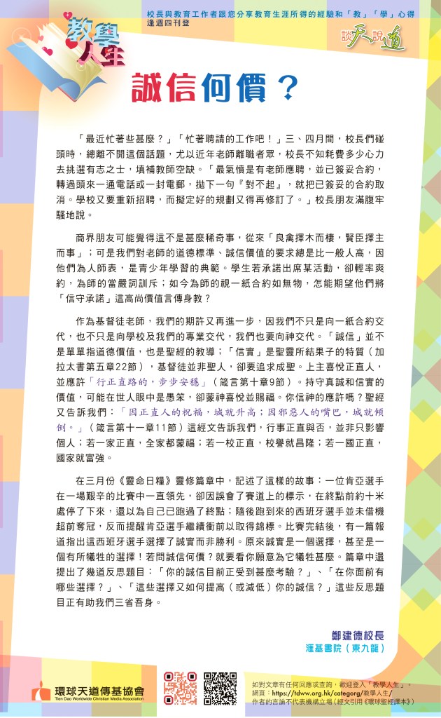 是的,為人師表要「傳道、授業、解惑」,看似都是頭腦上、學問上的事,但是沒有愛,這老師不過是「教書匠」。基督教尤其重視「愛」,例如大家都熟悉的經文:「現在存留的有信、望、愛這三樣,其中最大的是愛。」(哥林多前書第十三章13節)我覺得「如果我用人和天使的方言說話,卻沒有愛,我就成了嘈雜的鑼、刺耳的鈸。」(哥林多前書第十三章1節)也很適合老師斟酌;空有知識,卻不關愛學生的老師,還算不上是好老師!有時候,繁重的工作、頑皮的學生、重複的會議都會令老師們感到挫敗、沮喪,可能會懷疑自己,甚至想放棄離場。如果我們可以靜一靜、停一停,回到入行的起點,重拾那份使命感,重燃對學生的愛,相信我們很快便能振作起來,繼續教學的工作。