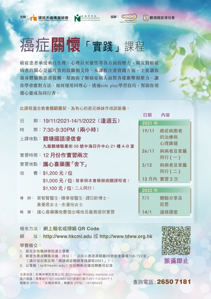 2. 郵寄支票或轉賬收據 地址:「沙田小瀝源源順圍28號都會廣場708-722室」(請於信封面註明「報讀癌症關懷實踐課程2021」);