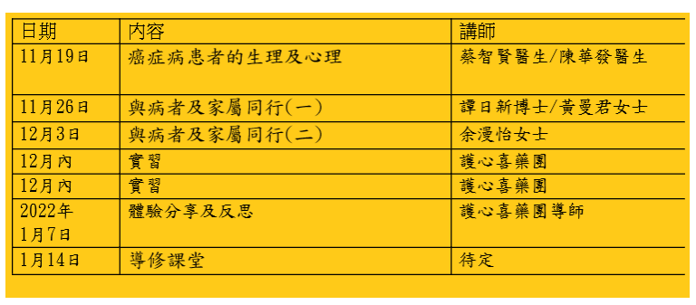 癌症患者承受來自生理、心理以至靈性等各方面的壓力。親友對癌症病者的關心是最珍貴的鼓勵和支持。本課程注重實踐方面,主要讓你親身體驗與患者接觸,幫助你了解癌症病人面對各樣衝擊和壓力,讓你學會應對方法,如何運用同理心,透過role play學習技巧,幫助你預備心靈成為同行者。