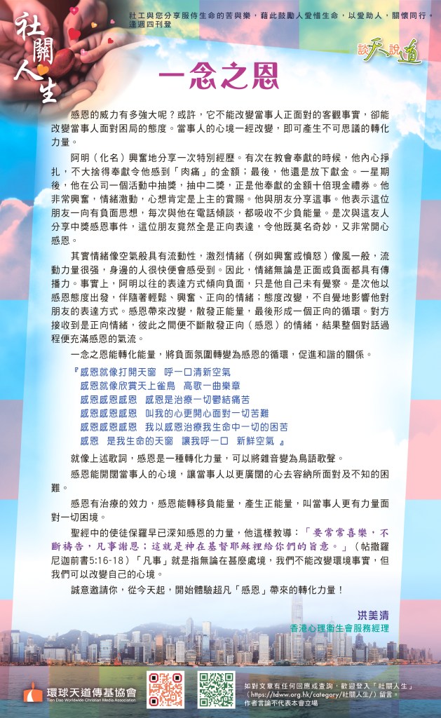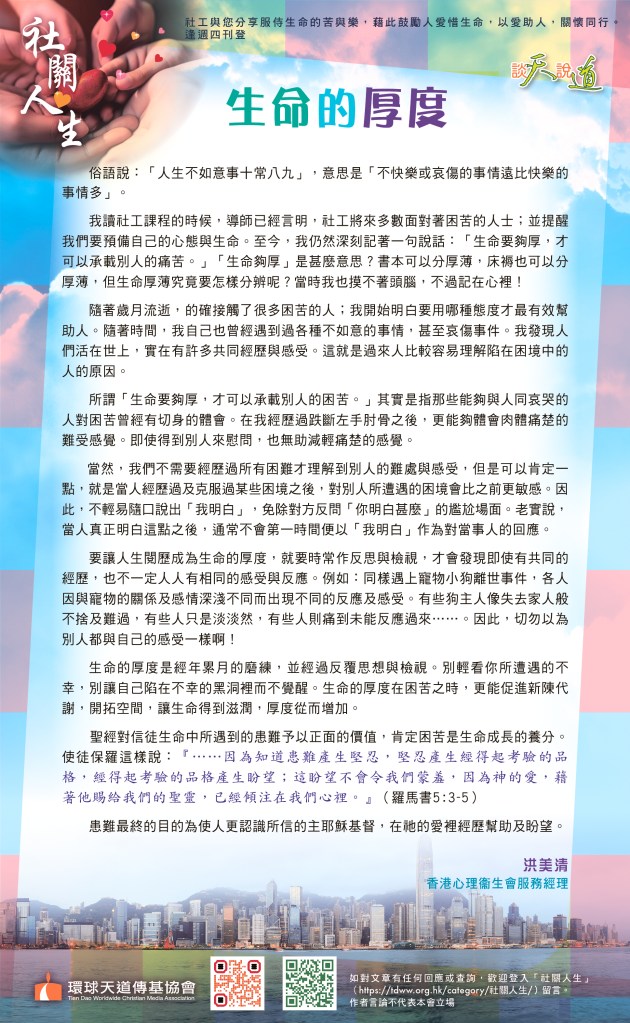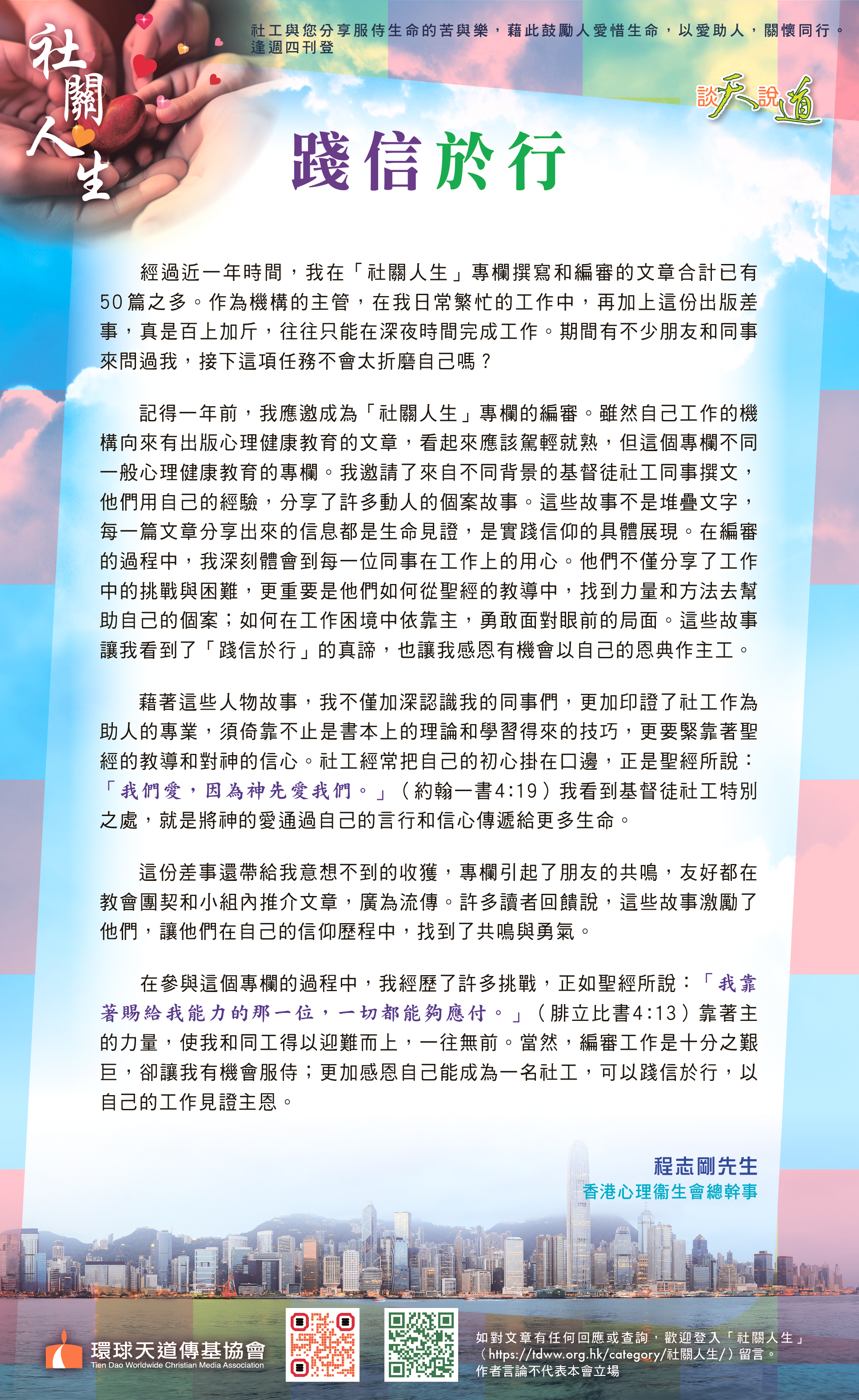 這些經歷讓我更加堅信,盼望是生命的燃料,是我們前行的動力。作為社工,我們有責任成為盼望的使者,將這份寶貴的禮物帶給那些正在受苦的人們。或許,我們能做的事只是在面談室裡耐心地傾聽一個人的心聲;或許,我們能做的事就只是在街頭牽起一個無家者的手,給他一個溫暖的飯盒;又或許,我們所能奉獻的僅僅是一次簡單的禱告。然而,這些看似微不足道的舉動,卻有可能成為上帝恩典的管道,讓祂的愛和盼望觸及更多生命。讓我們一起成為盼望的使者,用愛心和憐憫去服侍有需要的人,讓更多人能夠認識賜盼望的上帝。因為惟有祂,才是我們生命的磐石和拯救的盼望。