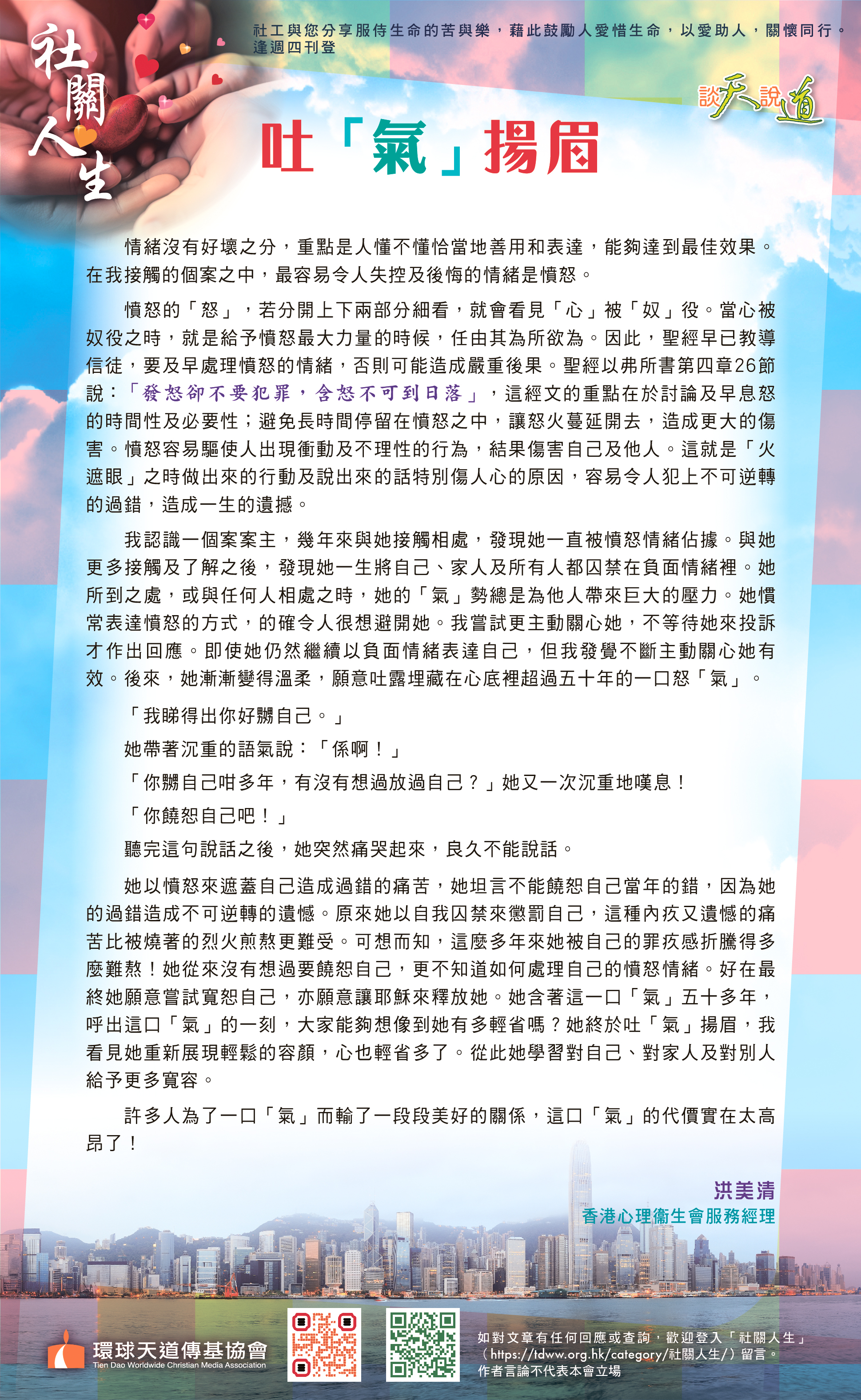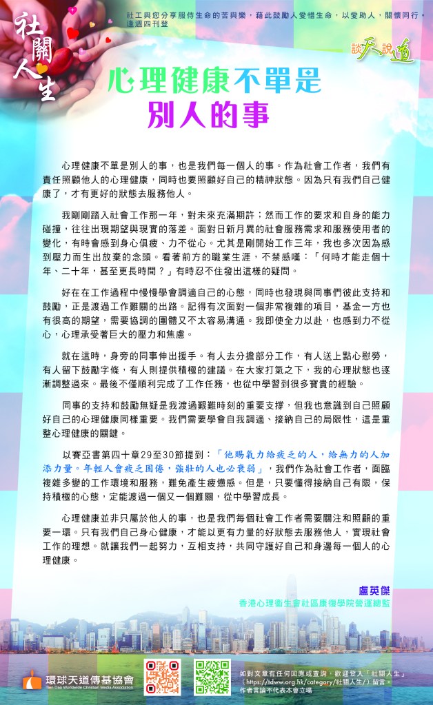 作為一名基督徒社工,尤其是在精神健康領域工作,我時常反思「盼望」這個主題。在日常工作中,我見證了許多人的掙扎與痛苦,他們面臨著各種心理健康問題,如憂鬱、焦慮、創傷後壓力症等。在最黑暗的時刻,上帝的話語是指引我們前行的明燈,為我們帶來不竭的盼望。