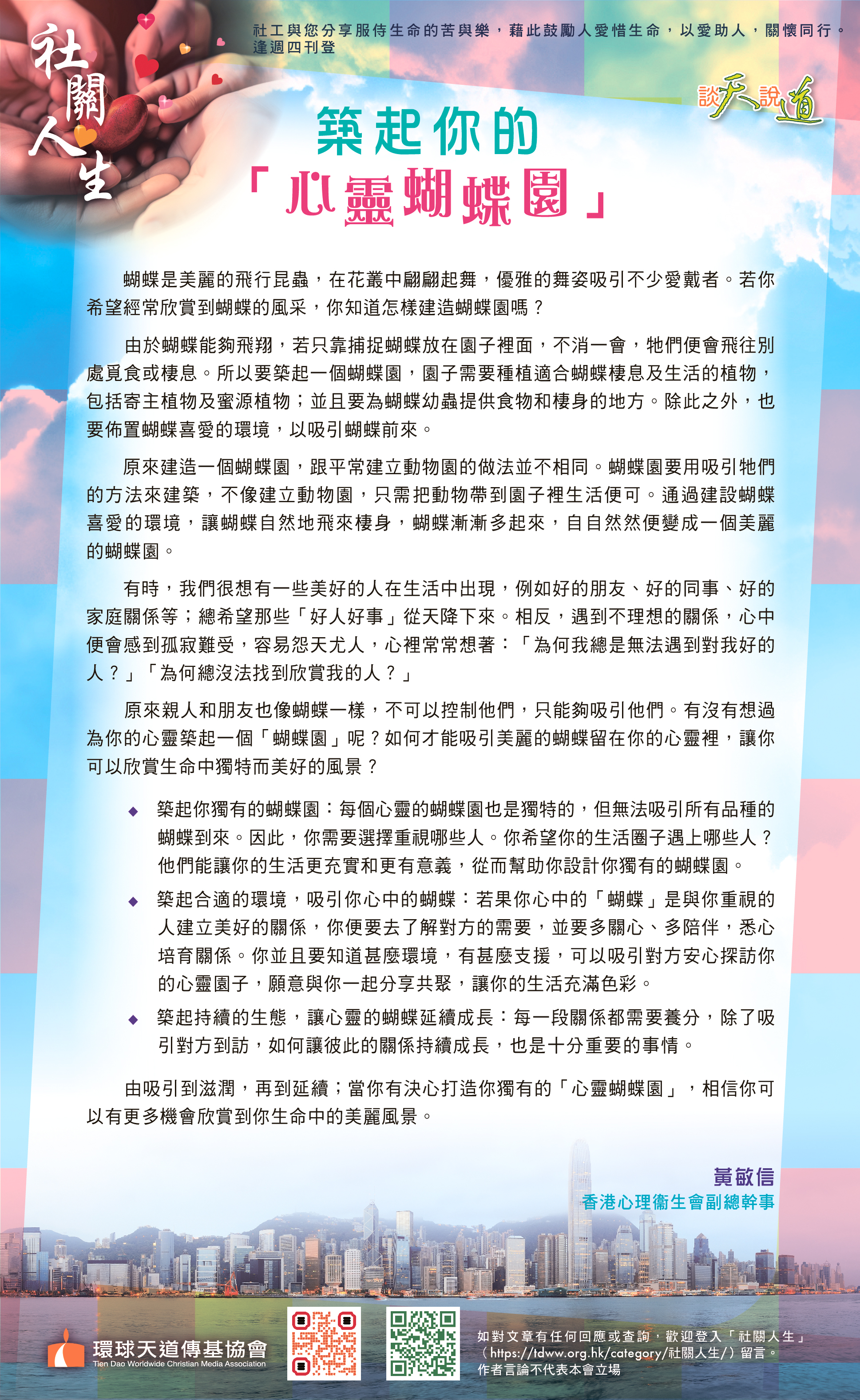 在服侍他人的路上,我也曾陷入失落和迷茫的處境。一個來自破碎家庭且有自殺傾向的青少年個案,讓我感到挫折和無力。儘管竭力支援,但這位少年的情況依然反覆。就在我灰心之際,一位姊妹的見證重新點燃我的盼望。她的兒子曾陷入吸毒的深淵,她憑著不離不棄的禱告,兒子終於在佈道會上信主獲得新生。這經歷讓我意識到,改變一個生命需要持久的信心和毅力;助人者所撒的種子也許不會立即發芽,但只要憑愛心並耐心地灌溉,終會開花結果。關鍵是將盼望緊緊繫於上帝,相信祂必成就善工。帶著這份重燃的盼望,我以新的眼光看待服侍的對象,不再只看眼前成效,而是將每次付出都獻給主。