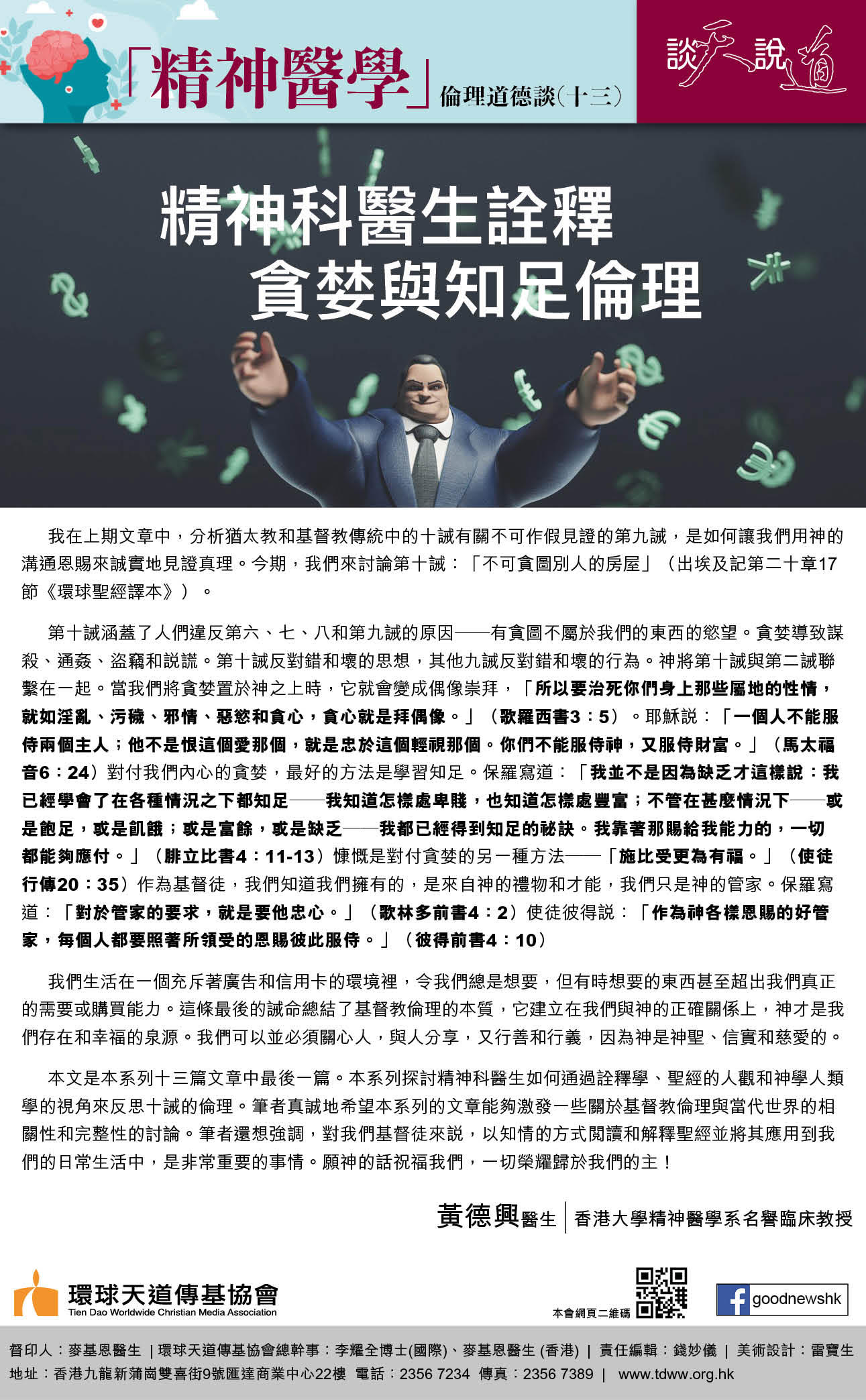 我在上期文章中,分析猶太教和基督教傳統中的十誡有關不可作假見證的第九誡,是如何讓我們用神的溝通恩賜來誠實地見證真理。今期,我們來討論第十誡:「不可貪圖別人的房屋」(出埃及記第二十章17節《環球聖經譯本》)。