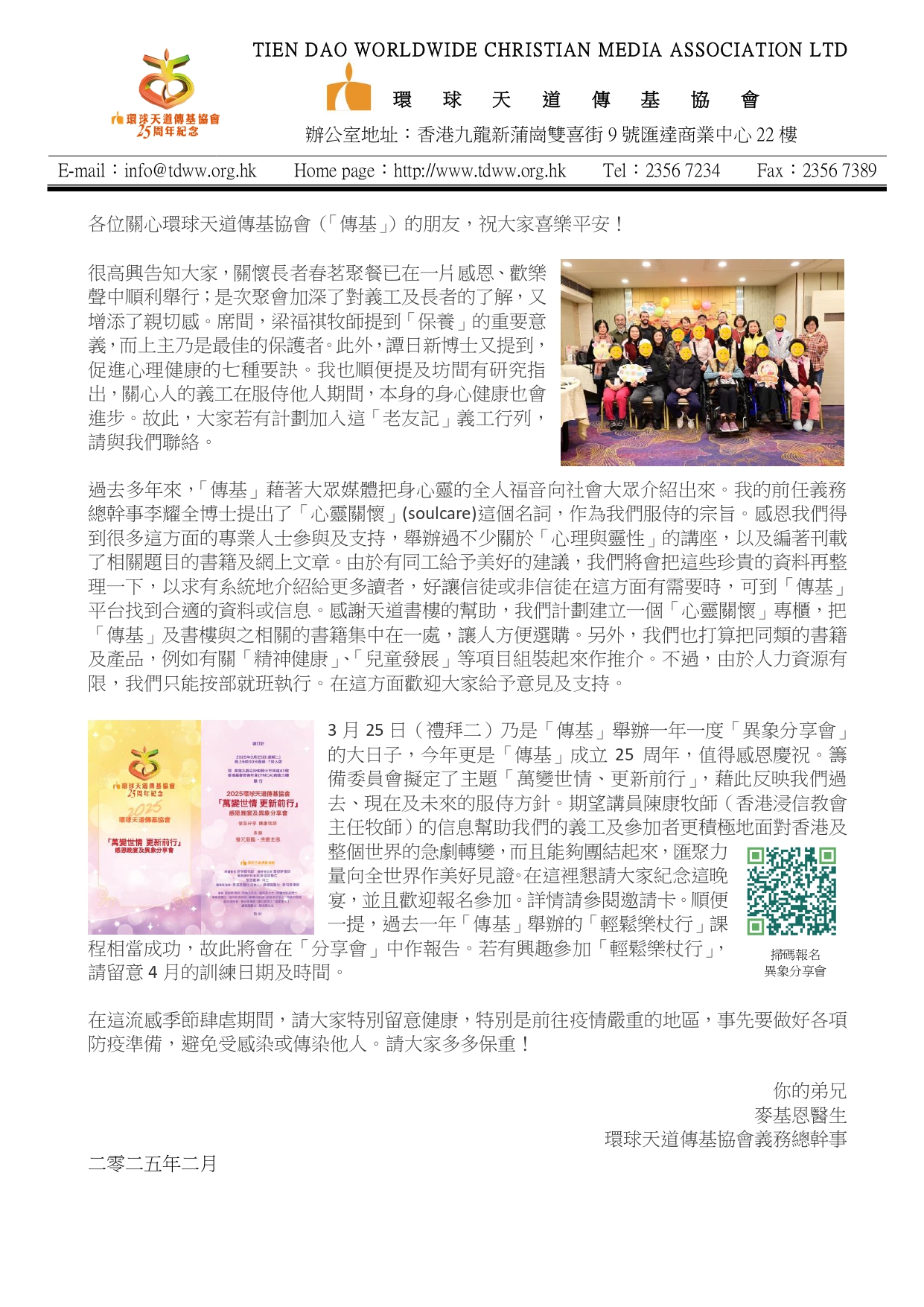 11月初,召開了機構一年一度的周年大會及董事會。會議中通過了繼續發展「傳基」原有的各項事工及未來發展的三個方向,包括長者身心靈服侍、調解培訓及服務和關心學童精神健康計劃。感謝各位董事的支持,讓事工能夠有序推進;然而,「傳基」也面對著挑戰,年度財政出現赤字。這提醒我們要切切仰望主的供應,也要更加慎重、更有智慧地運用金錢。懇請有感動的弟兄姊妹與我們同工,在奉獻及禱告上同心支持,讓我們能夠持續且加大力度推展各樣事工,繼續傳揚基督的福音,關愛老幼及需要扶助的人,榮耀主名!