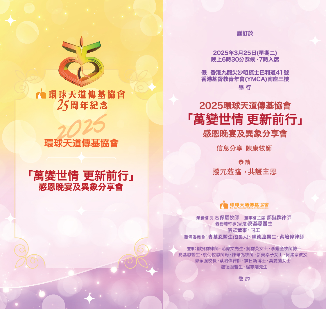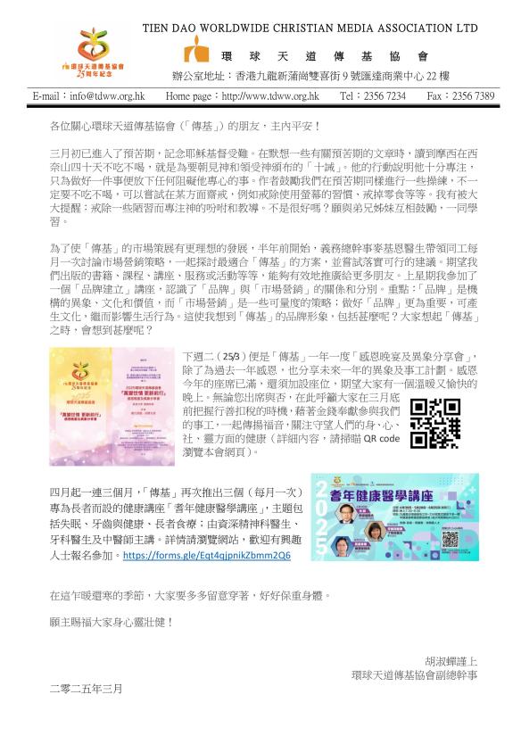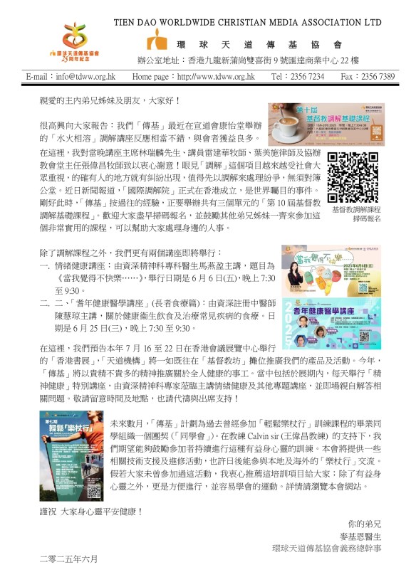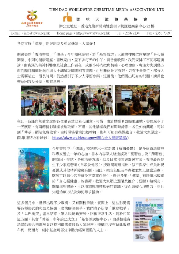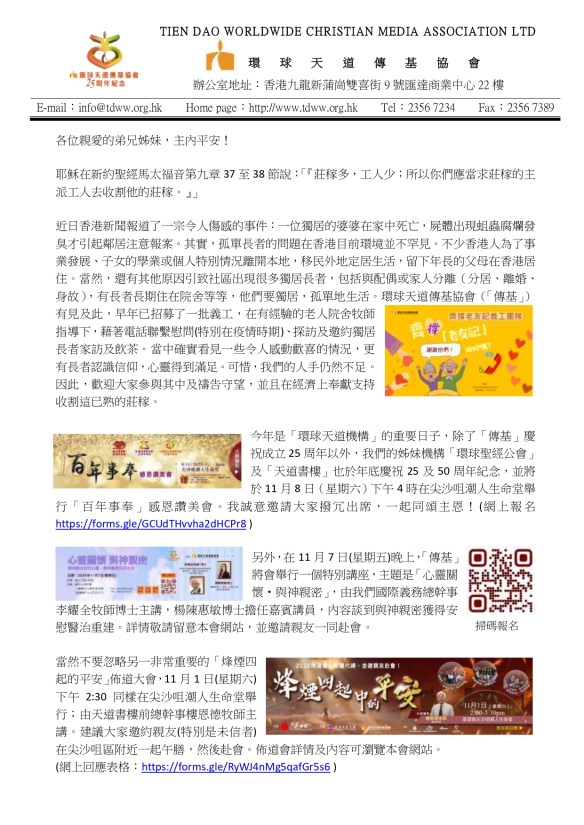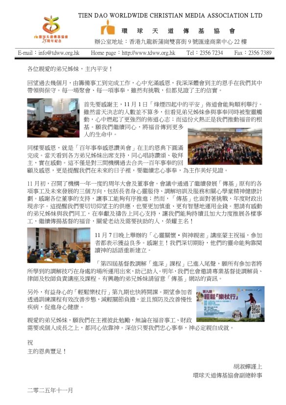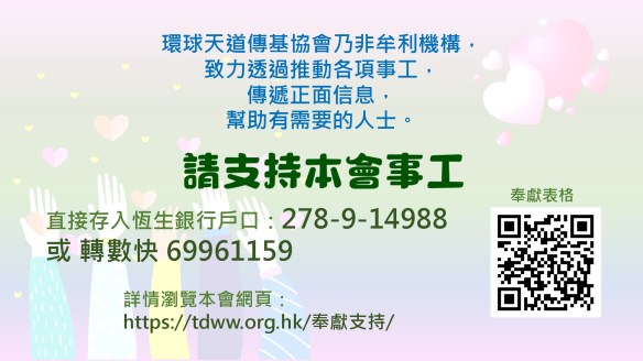 親愛的弟兄姊妹,願我們在主裡彼此勉勵,無論在福音事工、財政需要或個人成長之上,都同心依靠神。深信只要我們忠心事奉,神必定親自成就。