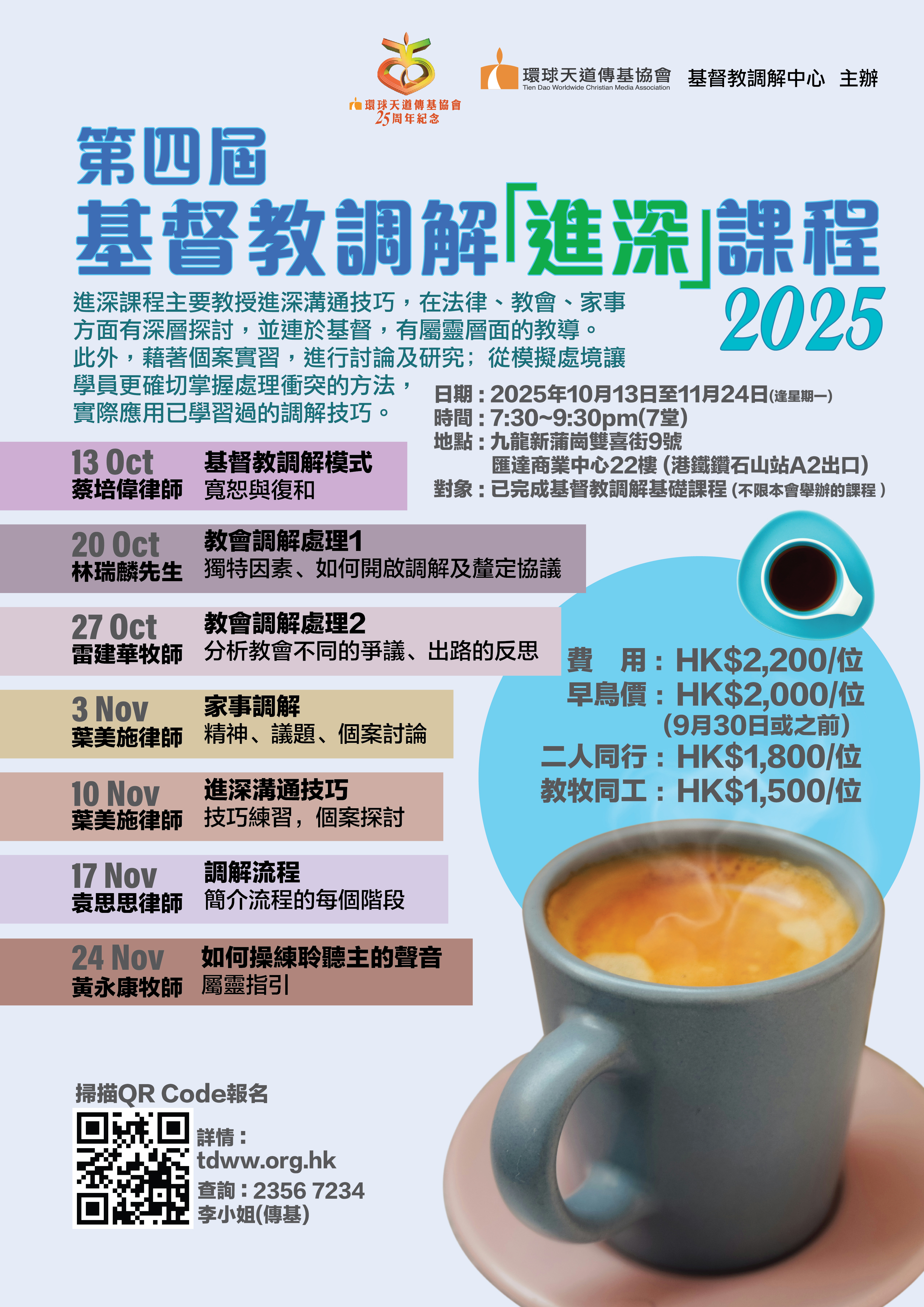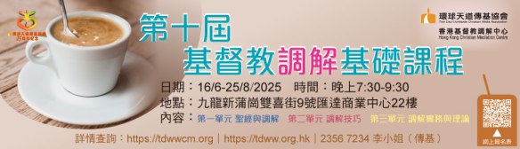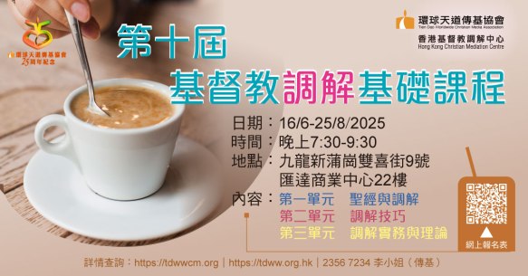 「第四屆基督教調解「進深」課程」已進入尾聲,願所有參加者將所學到的調解技巧在身處的場所運用出來,助己助人。明年,我們也會邀請專業基督徒調解員、律師及牧師負責講座及課程。有興趣的弟兄姊妹請留意「傳基」網站的資訊。