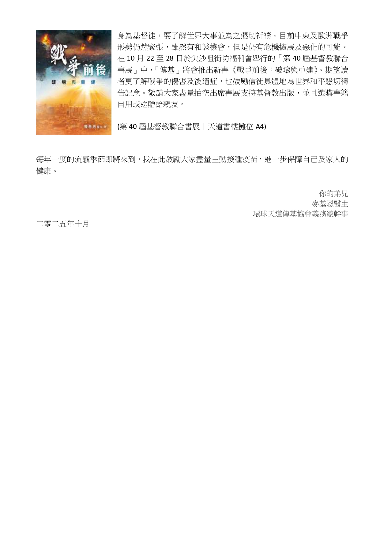 首先要感謝主,11月1日「烽煙四起中的平安」佈道會能夠順利舉行。雖然當天決志的人數並不算多,但看見弟兄姊妹參與事奉同時被聖靈觸動,心中燃起了更強烈的佈道心志;而這份火熱正是我們推動福音的根基。願我們繼續同心,將福音傳到更多人的生命中。