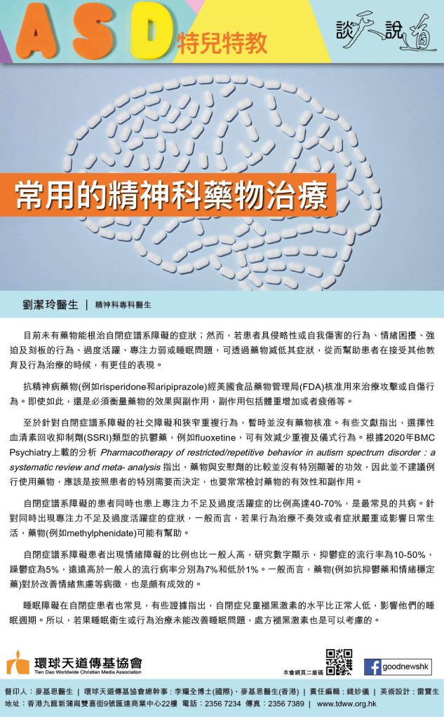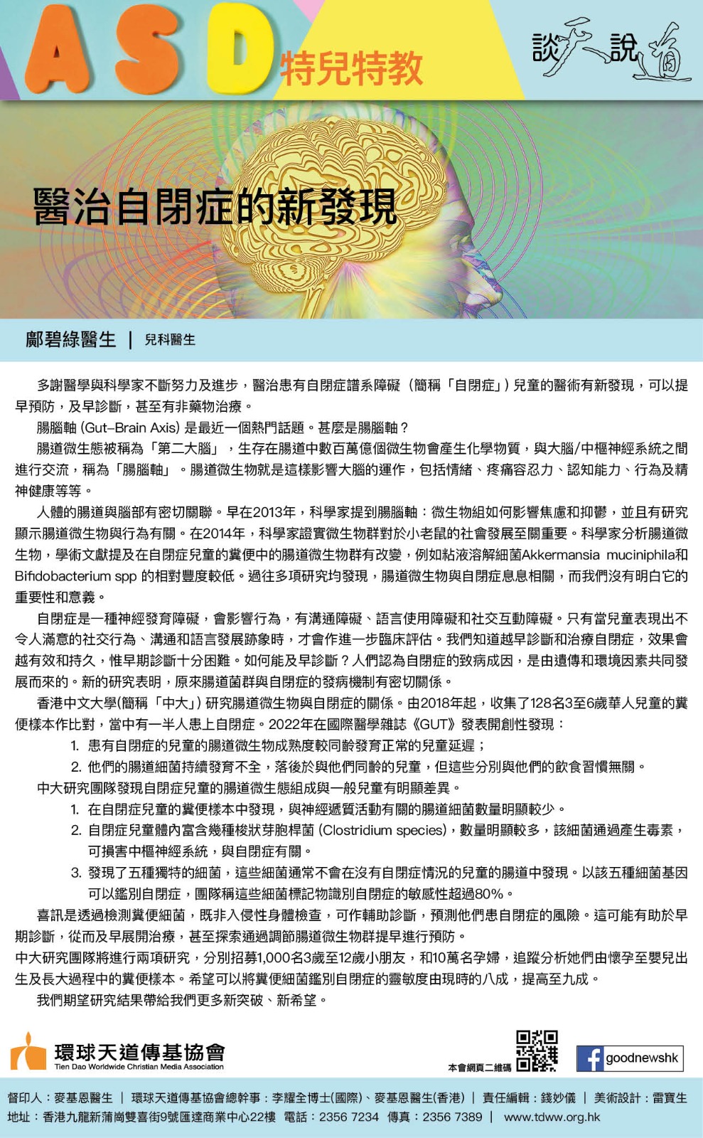 現今醫學已證實「自閉症譜系障礙」(Autism Spectrum Disorder,簡稱ASD)是一種長達整個人生的大腦發展問題,尤其影響病患者的社交溝通及行為表現。現時醫學上,多了不少對「專注力不足過分活躍精神障礙」(Attention Deficit/Hyperactivity Disorder,簡稱ADHD)病人的跟進研究,發現他們比其他人較容易有身體「共病」(co-morbidities),尤其是肥胖症及腸胃問題。