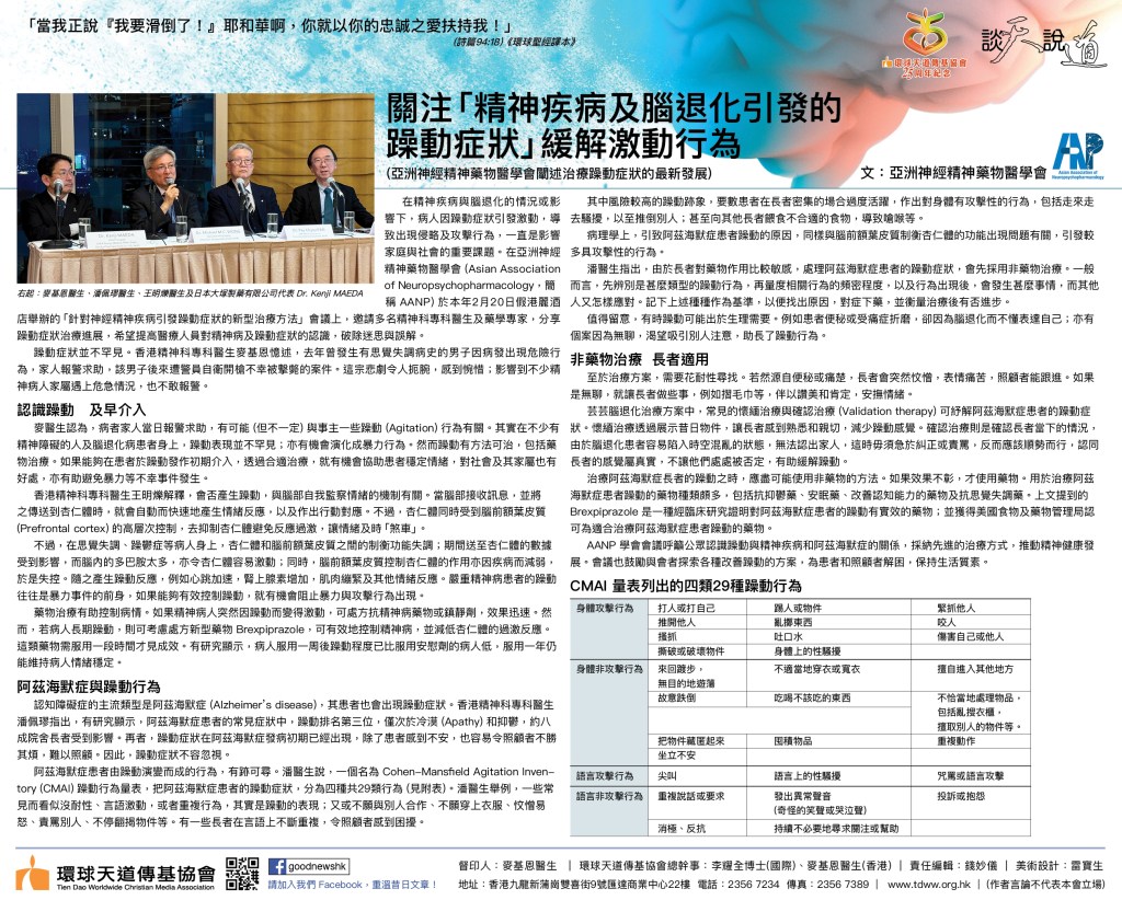 在精神疾病與腦退化的情況或影響下,病人因躁動症狀引發激動,導致出現侵略及攻擊行為,一直是影響家庭與社會的重要課題。在亞洲神經精神藥物醫學會(Asian Association of Neuropsychopharmacology,簡稱AANP)於本年2月20日假港麗酒店舉辦的「針對神經精神疾病引發躁動症狀的新型治療方法」會議上,邀請多名精神科專科醫生及藥學專家,分享躁動症狀治療進展,希望提高醫療人員對精神病及躁動症狀的認識,破除迷思與誤解。