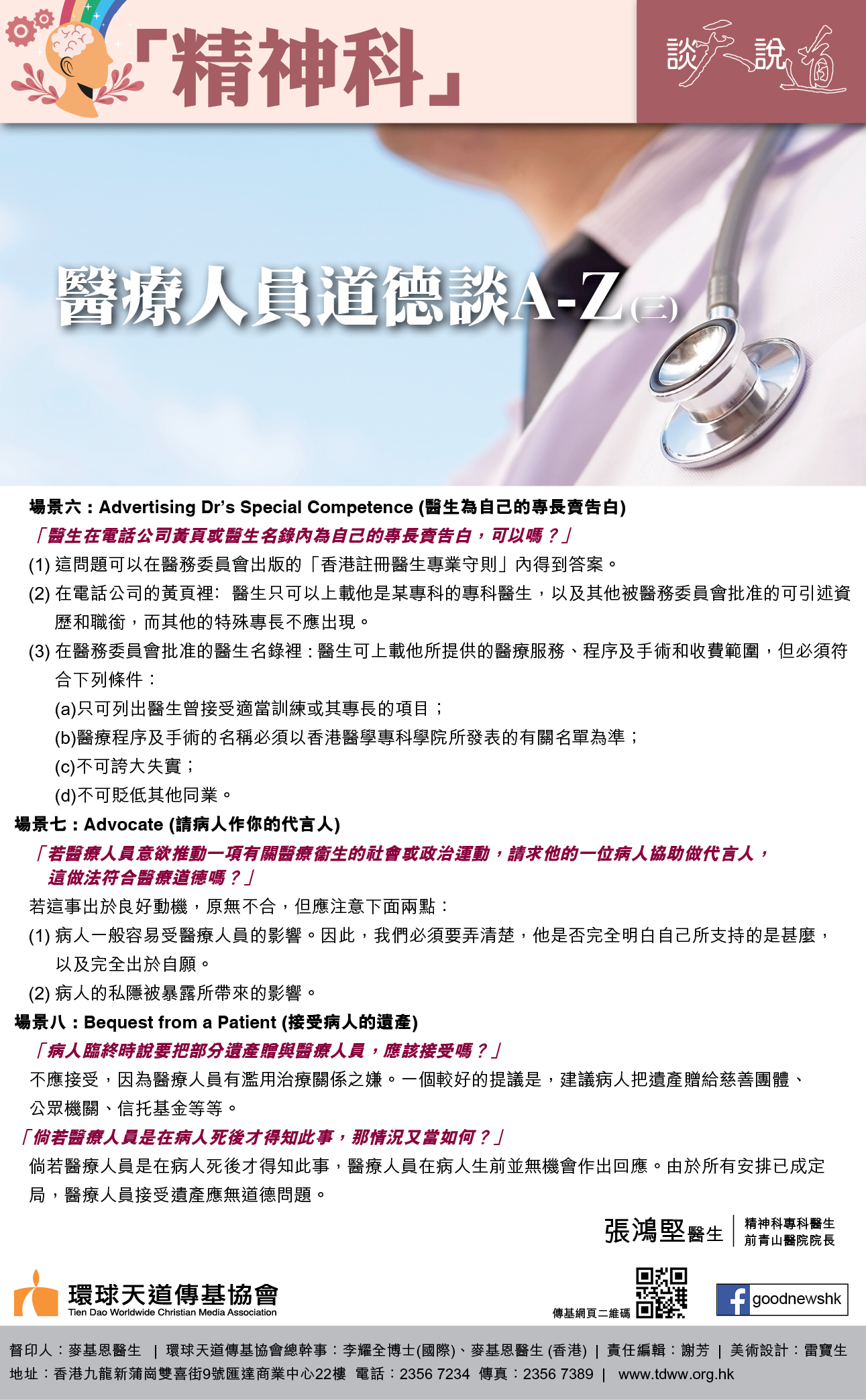 (1)這問題可以在醫務委員會出版的「香港註冊醫生專業守則」內得到答案。