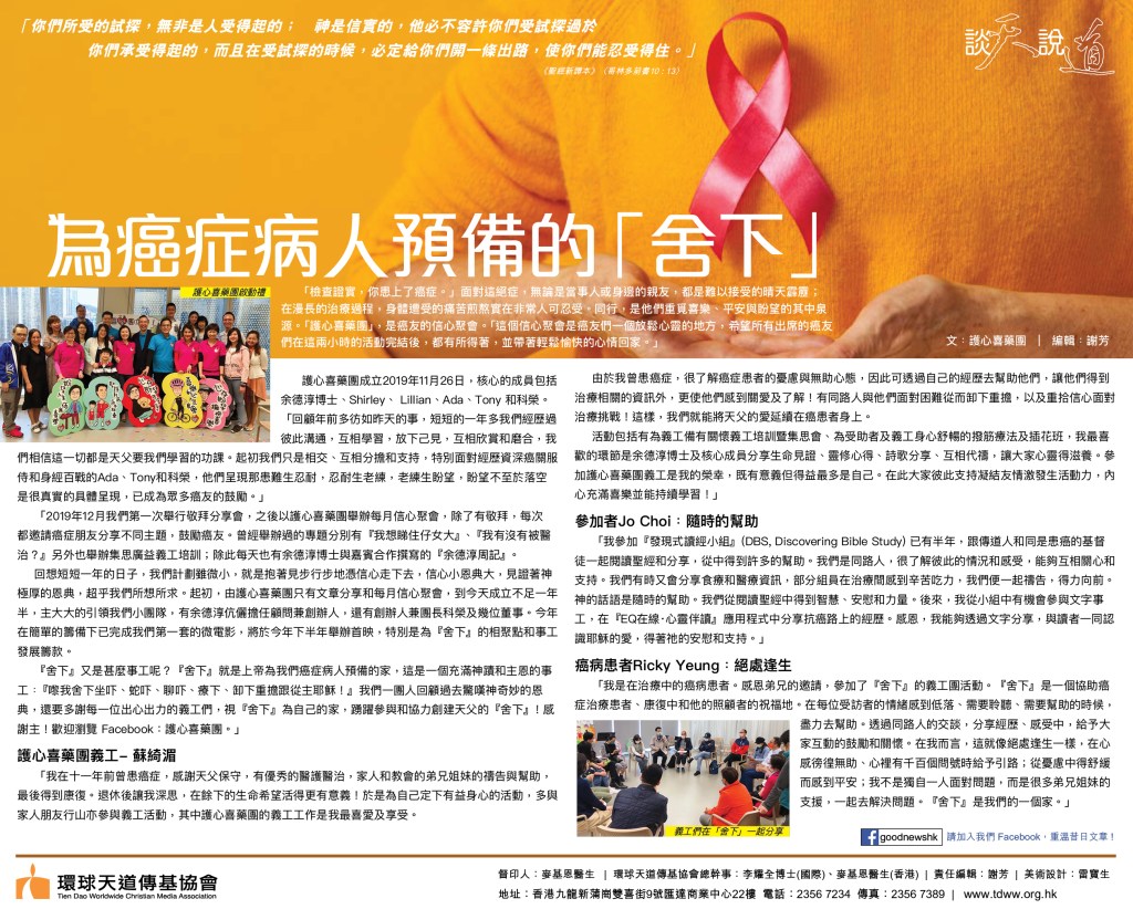 「我是在治療中的癌病患者。感恩弟兄的邀請,參加了『舍下』的義工團活動。『舍下』是一個協助癌症治療患者、康復中和他的照顧者的祝福地。在每位受訪者的情緒感到低落、需要聆聽、需要幫助的時候,盡力去幫助。透過同路人的交談,分享經歷、感受中,給予大家互動的鼓勵和關懷。在我而言,這就像絕處逢生一樣,在心感徬徨無助、心裡有千百個問號時給予引路;從憂慮中得舒緩而感到平安;我不是獨自一人面對問題,而是很多弟兄姐妹的支援,一起去解決問題。『舍下』是我們的一個家。」